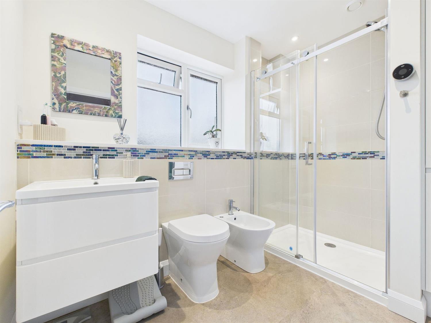 Luxury En-Suite ShowerFrosted double glazed rear aspect. Oversized shower cubicle with Mira digital shower, wall bracket and hand shower, extractor fan, sliding glass screen, tiled walls, mosaic glass, tiled relief. RAK bidet, back to wall WC with chrome dual flush, wall mounted vanity wash hand basin with chromium mixer tap and drawers under, marble vanity shelf, chrome towel warmer, recessed full-height cabinet, downlighting.