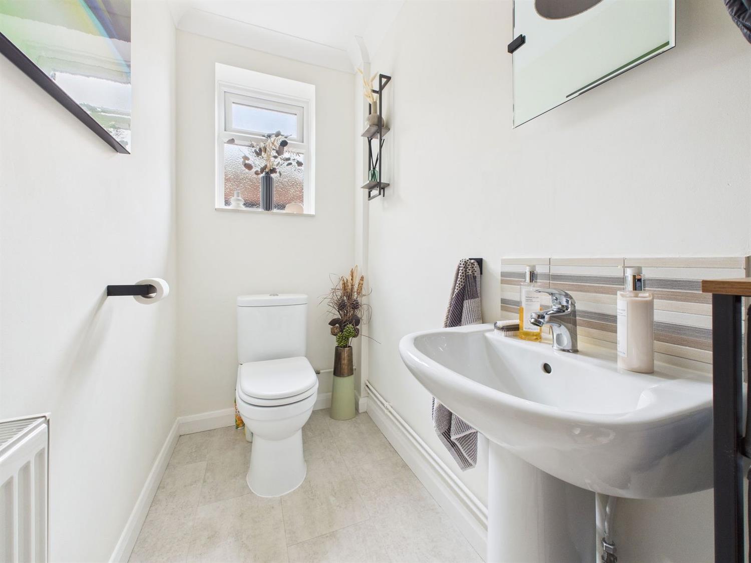 CloakroomFrosted double glazed side aspect, low level WC, pedestal wash hand basin with chromium mixer tap and tiled splashback, radiator, wall mirror, Karndean flooring.