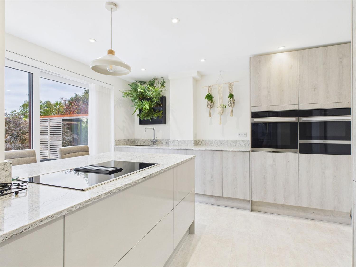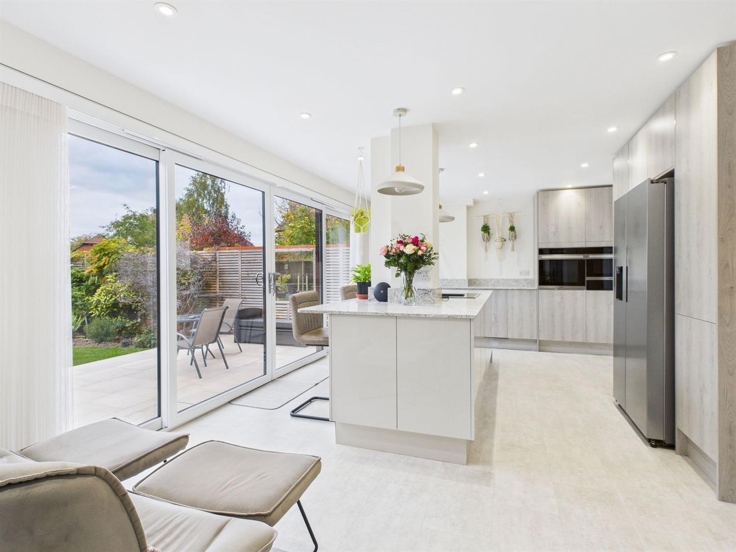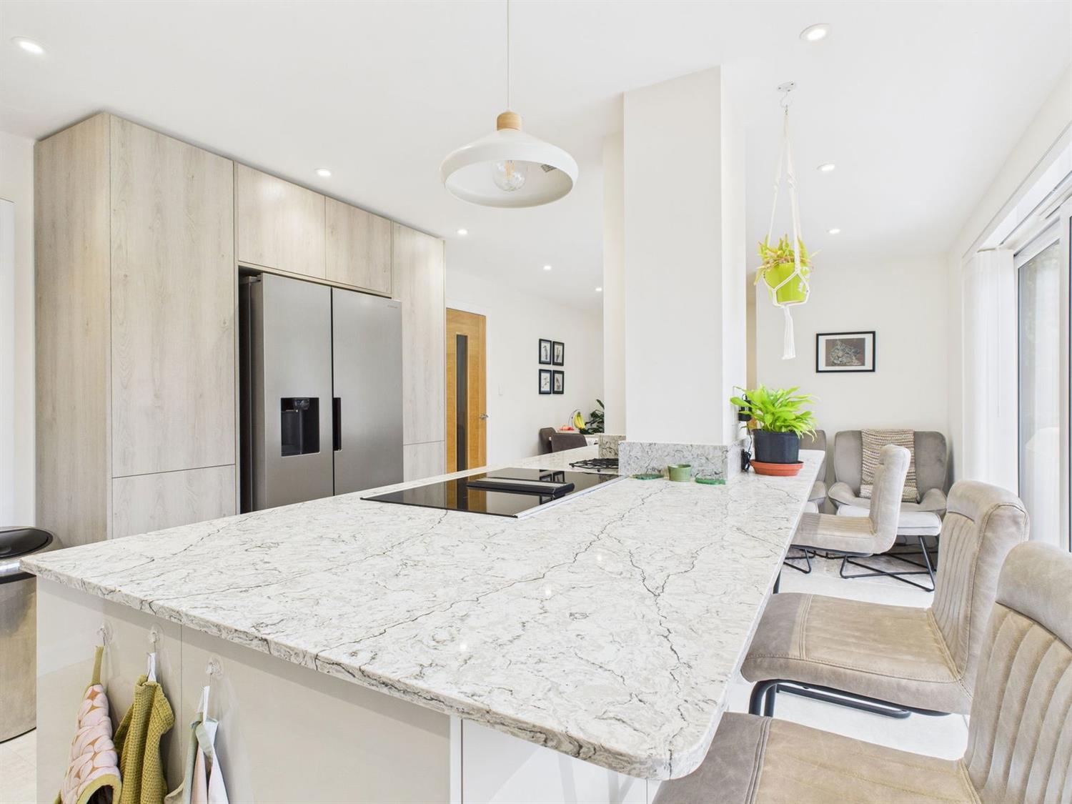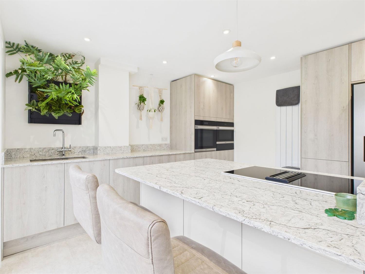 Kitchen/Dining Room/Family RoomNear full-width double glazed rear aspect with twin sliding patio doors to garden, full-width Day-to-Night walk-through Roman blinds, central quartz topped peninsula with inset induction hob incorporating a down-draft extractor, pan drawers and extensive range of cupboards, breakfast bar with seating area. Space for American style fridge/freezer with an upright larder cupboard having pull-out shelves, and an upright shelved cupboard either side, wide quartz worktop surface with an inset 1 1/2 bowl sink having chromium monobloc tap with an instant boiling water feature, integrated Bosch dishwasher, Hotpoint fan oven and microwave, plate warmer, two upright designer radiators, downlighting, Karndean flooring throughout. Oak door to