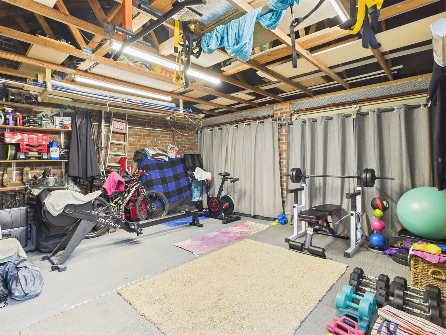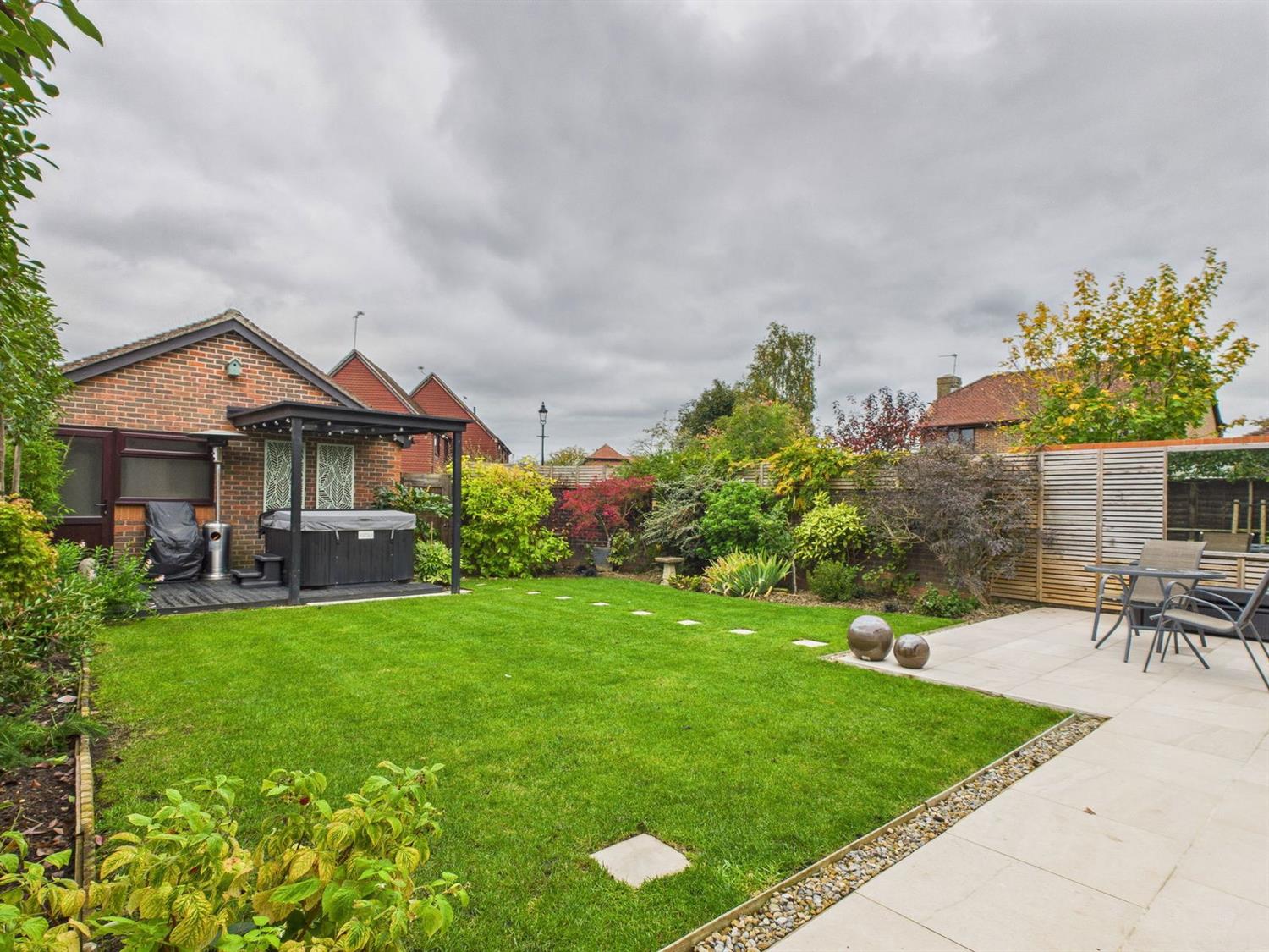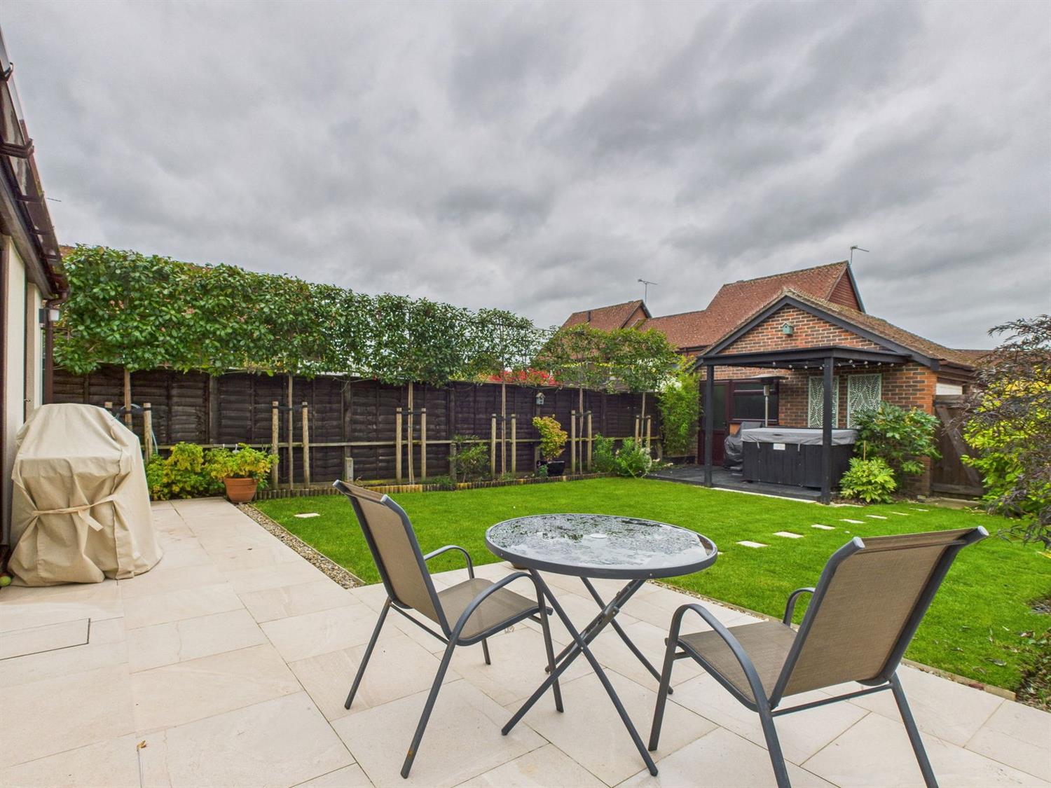 detached double width garage with twin metal up and over doors, power and light and door to rear garden. To the front of the property there is a further gravel drive with Portuguese Laurel hedging and flower and shrub borders, providing additional parking for three vehicles. Timber garden shed and bin store area. A gated side access leads to a beautiful landscaped rear garden which enjoys a sunny South/South Westerly aspect and features a full-width porcelain paved patio, an area of lawn with porcelain stepping stones and flower and shrub borders, and leading to an area of raised decking with a covered Pergola and space and power for a hot tub. The garden is bordered on one side by Red Robin Pleached trees providing a good deal of privacy, and a brick wall with horizontal panelled fencing to the other side along with gated rear access.