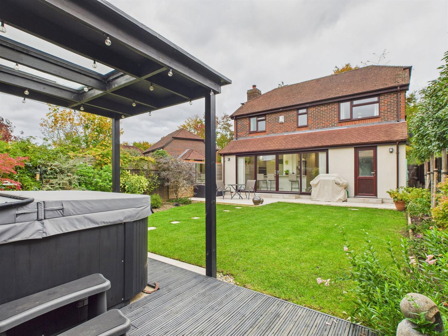 Situated at the end of a private drive (shared with only one other household), and fronting an area of wooded copse, is this beautifully presented detached family residence located on the North side of Horsham. Having been enlarged and extensively refurbished by the current owners, the property offers very well presented and flexible living accommodation featuring light Oak doors to all rooms, attractive Karndean flooring in the hall and extending through to the cloakroom and a fabulous light and airy kitchen-dining/family room, a modern luxury bathroom and en-suite shower, and a Hive heating system. A stylish staircase with glass panels and Oak balustrade rises to the first floor where there are three double bedrooms, the luxury family bathroom and en-suite shower room. On the ground floor, off the entrance hall, there is a comfortable sitting room, a double aspect study/family room, and a cloakroom. The focal point of this delightful home has to be a fantastic kitchen-dining/family room with its large quartz topped centrepiece and extensive range of base line cupboards and drawers with quality integrated appliances, and having a wonderful outlook over a delightful landscaped, West backing garden. The property is approached along a private drive which is shared with the neighbouring property and to the front is a detached double width garage. There is also private parking for at least three vehicles. The vendor's sole agent Courtney Green strongly recommends an internal inspection to appreciate the fine features and quality of this fantastic family residence.