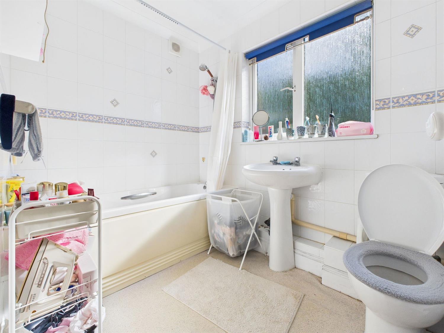 BathroomThe bathroom is fitted with a white suite comprising an enclosed panel bath with mixer taps and shower over, pedestal wash hand basin, and low-level WC with dual flush. There is a radiator, full-height wall tiling, obscured rear aspect window, and extractor fan.