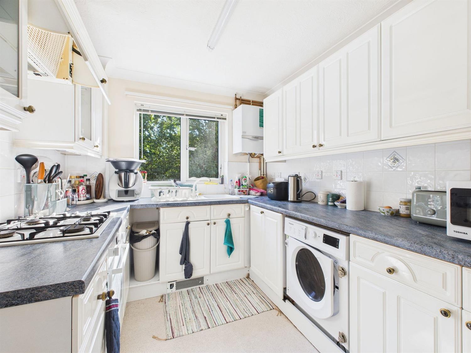 KitchenFitted with a range of eye and base level cabinets and drawers with contrasting worktops, a composite one-and-a-half bowl sink with mixer tap, an integrated electric oven with four-burner gas hob and concealed extractor hood, and an integrated washing machine, space for a fridge/freezer, a wall-mounted Vaillant gas-fired boiler, and a rear aspect window overlooking the attractive communal gardens.
