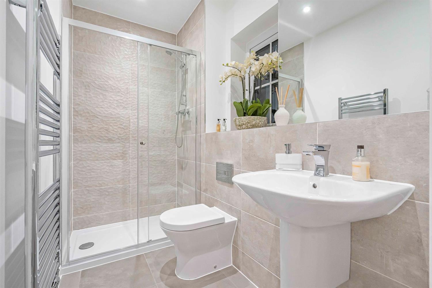 Second Ensuite Shower Room A luxury shower suite comprising Roca sanitary ware and fittings with oversized walk-in shower, shower mixer and shower attachment, low-level WC with concealed dual flush, wall hung wash hand basin with mixer tap, heated towel radiator, shaver point, obscured front aspect window, downlighting and extractor fan.