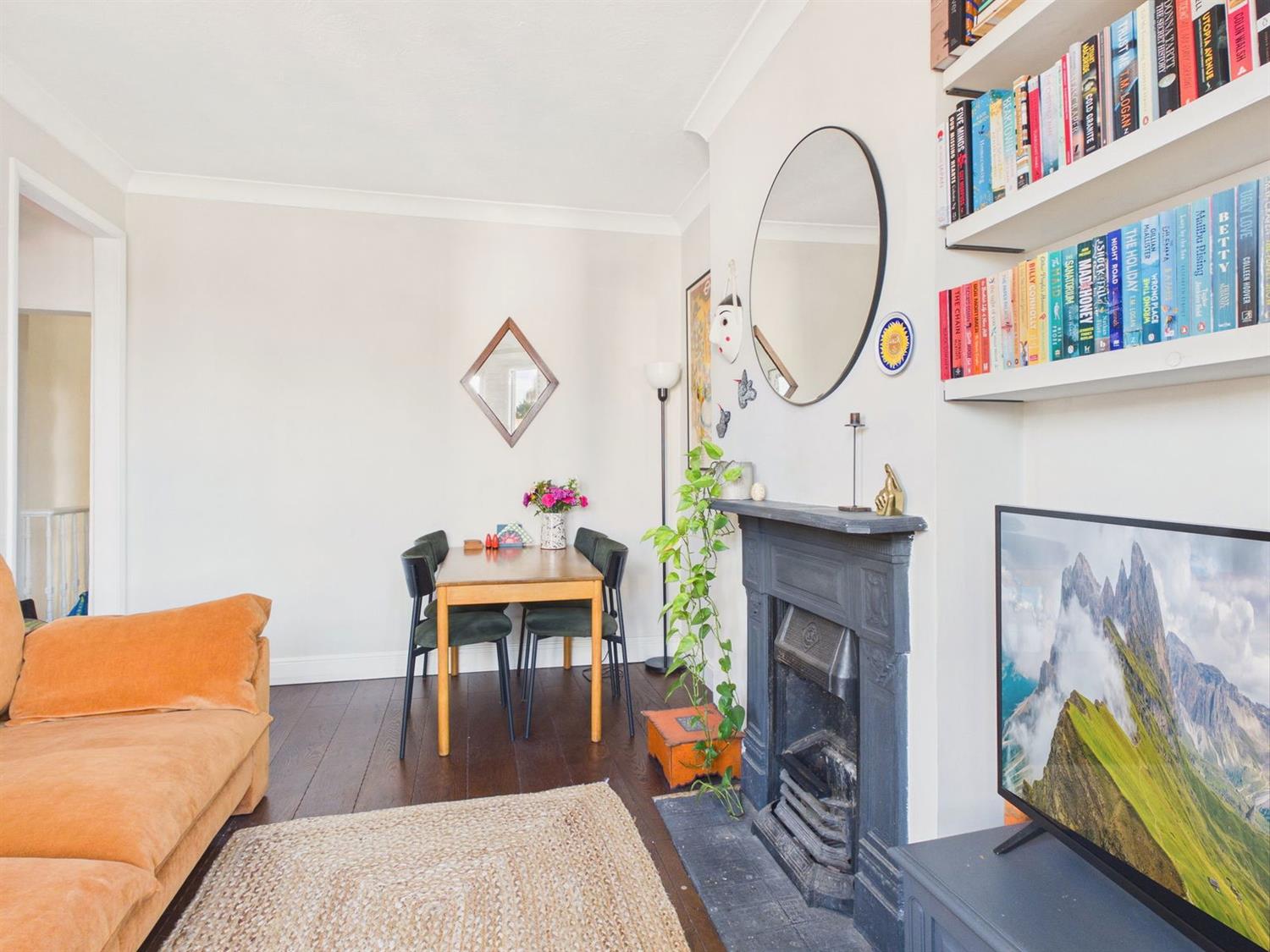 Living RoomDouble glazed bay front aspect with plantation shutters, chimney breast with cast iron fireplace, dark wood effect flooring.