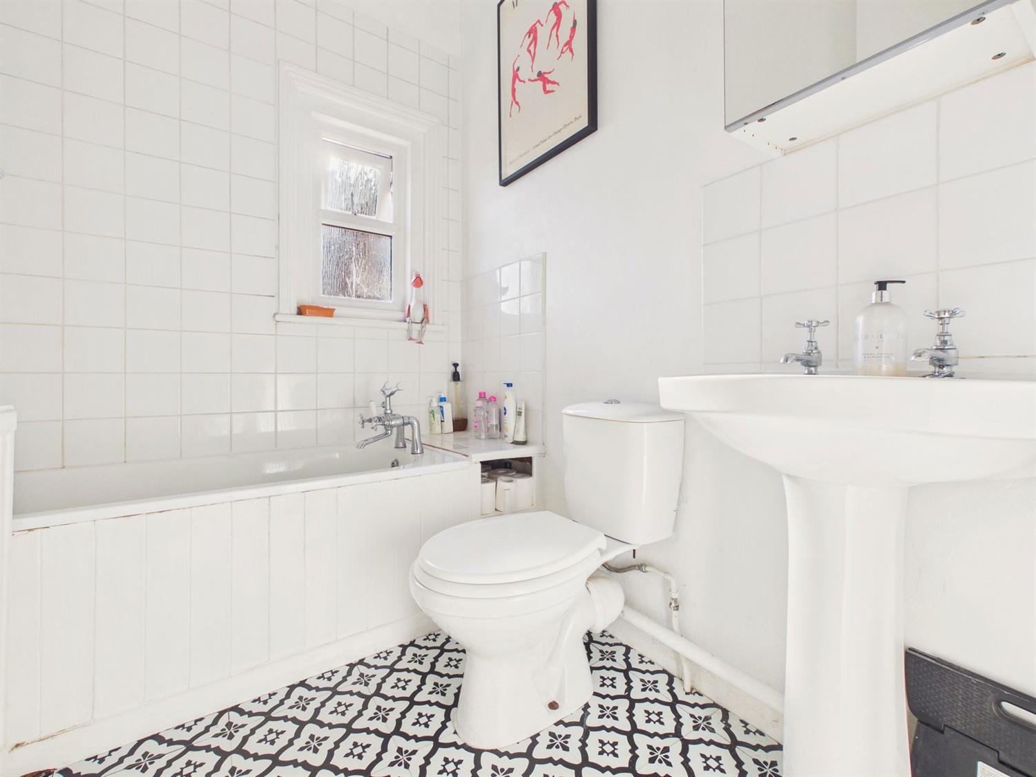 BathroomFrosted double glazed side aspect fitted with a white suite comprising panel bath with chromium mixer tap, wall mounted Triton Enrich electric shower unit with wall bracket and hand shower, localised tiling, low level WC, pedestal wash hand basin with chromium taps, tiled splashback.