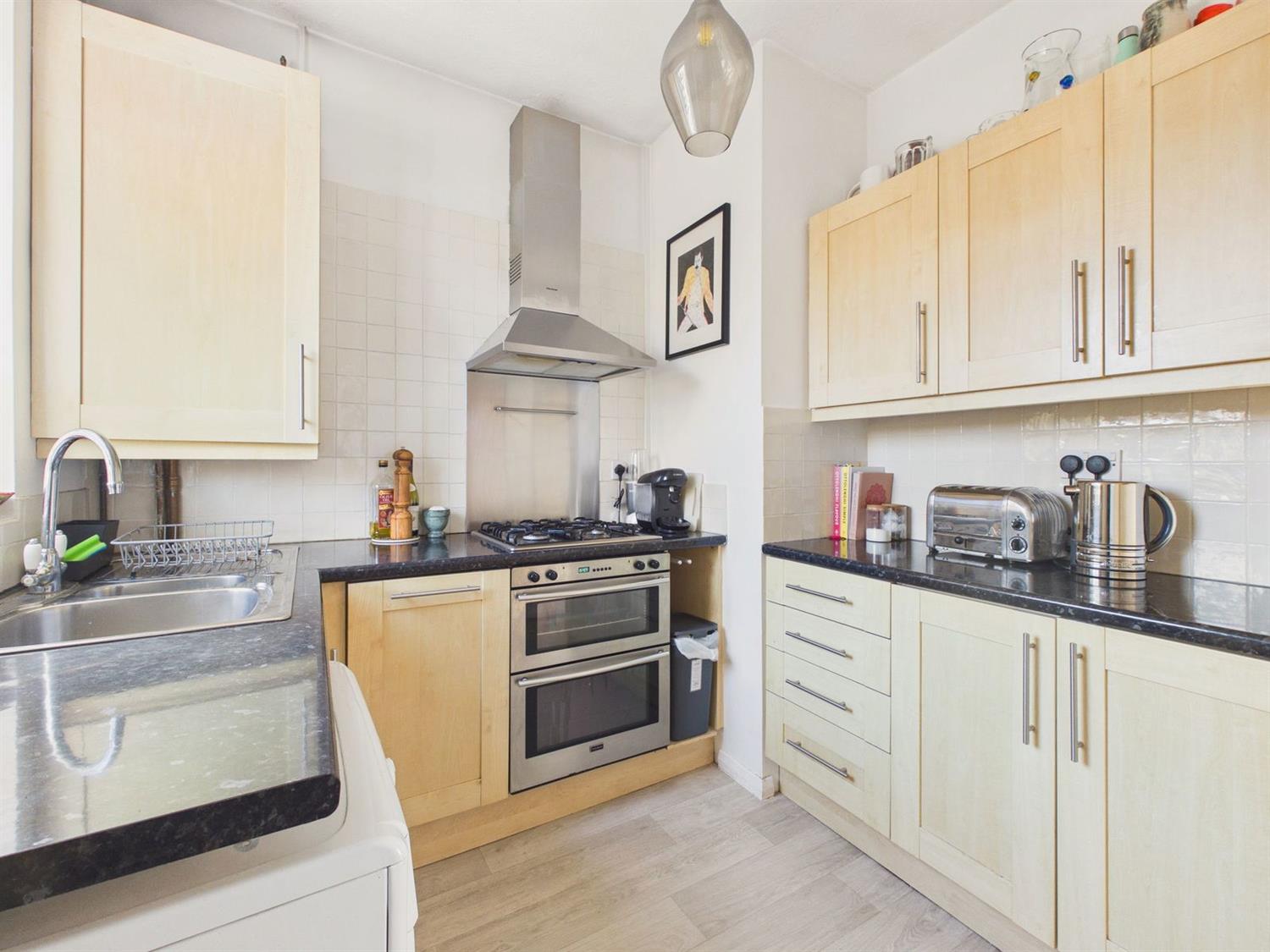 KitchenDouble glazed rear aspect. Fitted with a range of base and wall mounted cupboards and drawers in light wood effect and having complementing worktop surfaces incorporating a 1 1/2 bowl single drainer stainless steel sink, four ring stainless steel gas hob and splashback with filter hood over, double oven, space for a fridge freezer, space and plumbing for a washing machine, ceramic tiled splashback, radiator, shelved cupboard, concealed Logic Heat 15 combination gas fired boiler.