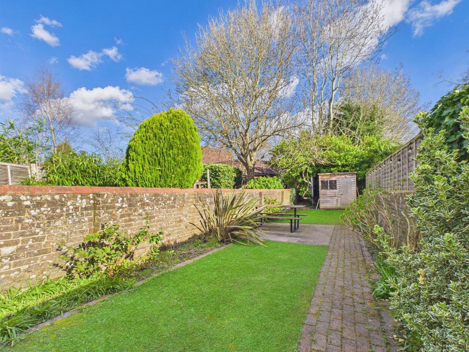 Gated side access leads to the rear garden which is of a good size and comprises paved path leading to central patio area, synthetic lawns, flower and shrub beds, timber garden shed. The garden is bordered by original brick walls.