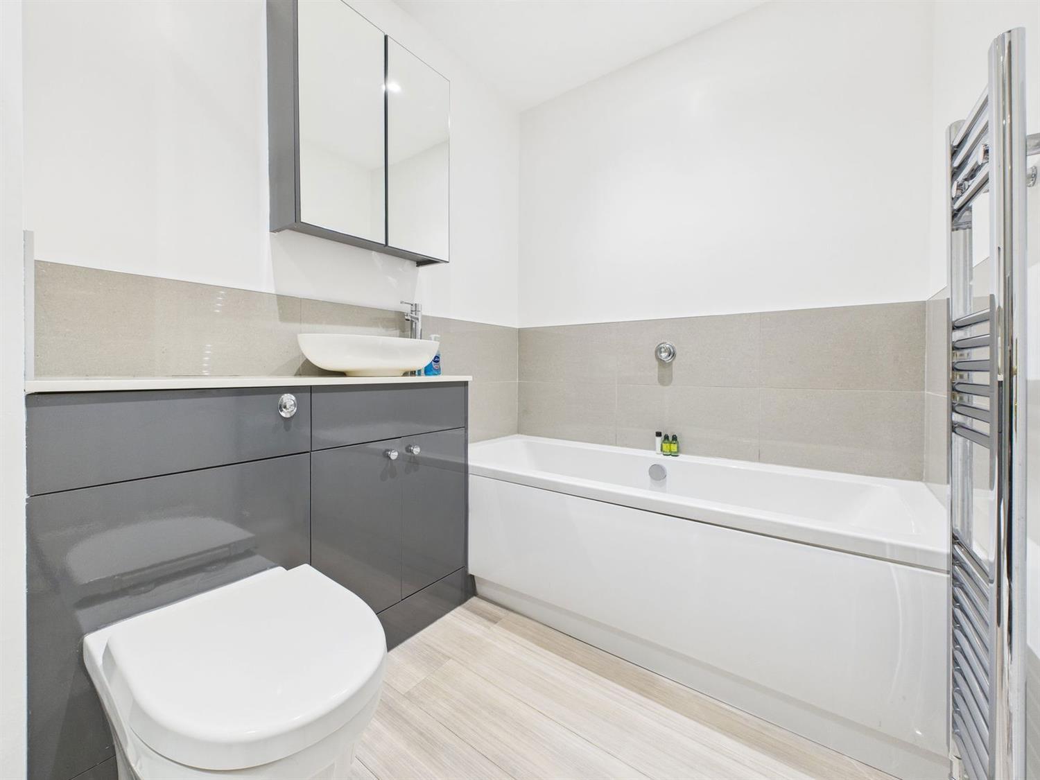 BathroomA luxury bathroom suite comprising a Mira bath and shower with floor to ceiling stone effect tiles, walk in shower with frameless glass screen, digitally controlled thermostatic shower with wall mounted shower attachment and rainfall shower head, recessed tiled niche, low-level WC with concealed dual flush, round countertop wash hand basin with chrome mixer tap and storage below, mirrored vanity unit with shaver point, deep enclosed panel bath with digital thermostatic mixer control, extractor fan, Karndean flooring and chrome heated towel rail.