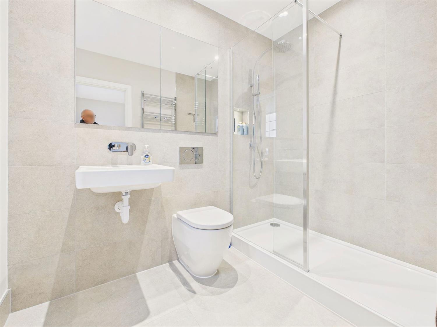 En-Suite Shower RoomWith frosted leaded double glazed side aspect. Laufen wall mounted wash hand basin with chromium mixer tap, Laufen back to wall WC with Geberit chromium dual flush, oversized shower cubicle with wall bracket and hand shower and overhead drencher unit, chromium thermostatic shower control, localised tiling, chromium towel warmer, recessed mirrored cabinet with light, gloss and glass shelving, porcelain tiled flooring, downlighting.