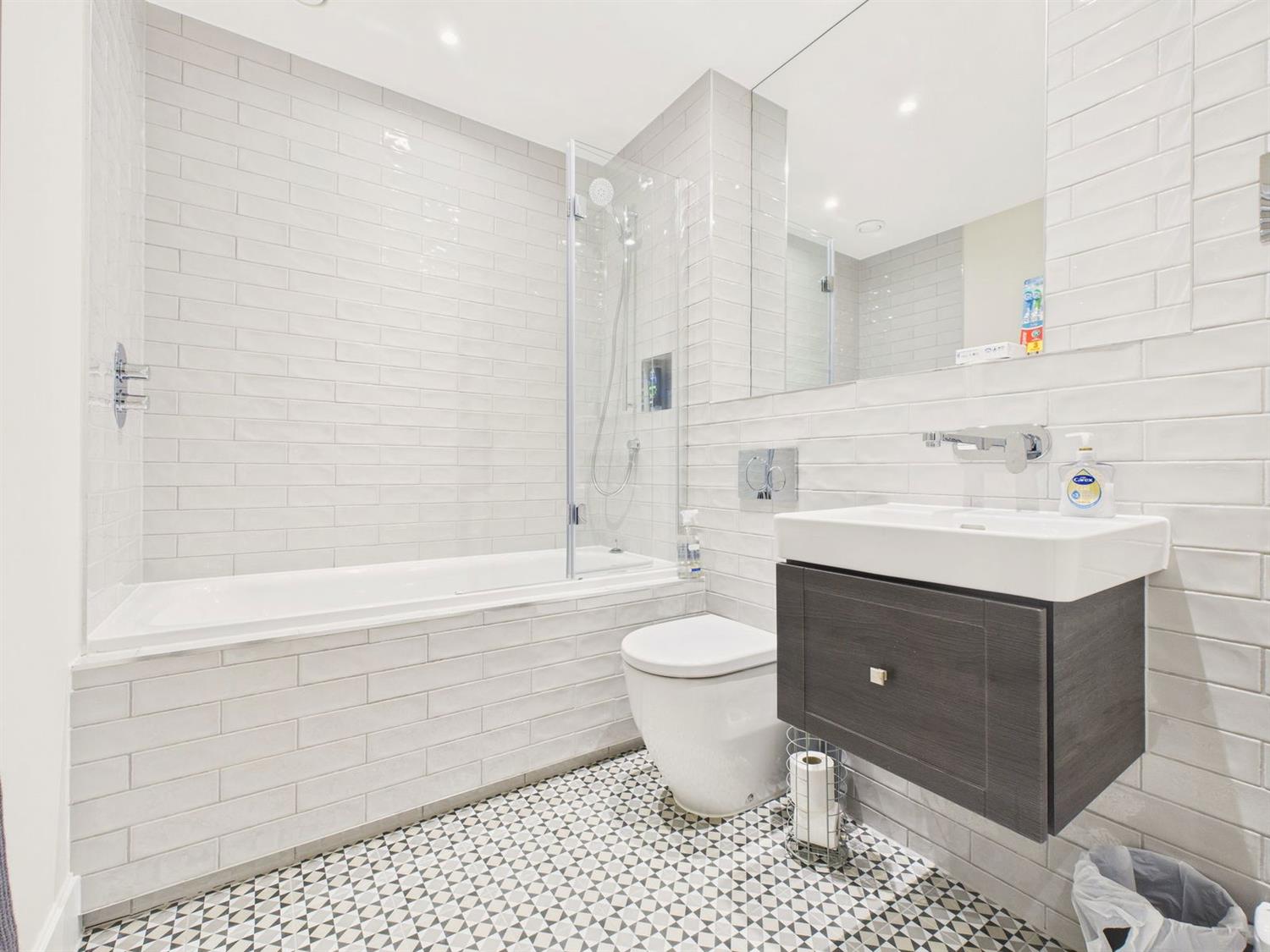 BathroomFitted with a luxury white suite comprising tiled panel bath with chromium thermostatic shower control and filler, wall bracket and hand shower, Laufen wall mounted wash hand basin with chromium mixer tap and drawer unit under, Laufen back to wall WC with Geberit chromium dual flush, localised ceramic tiled walls, wall mirror, shaver point, chromium towel warmer, patterned tiled flooring, downlighting.