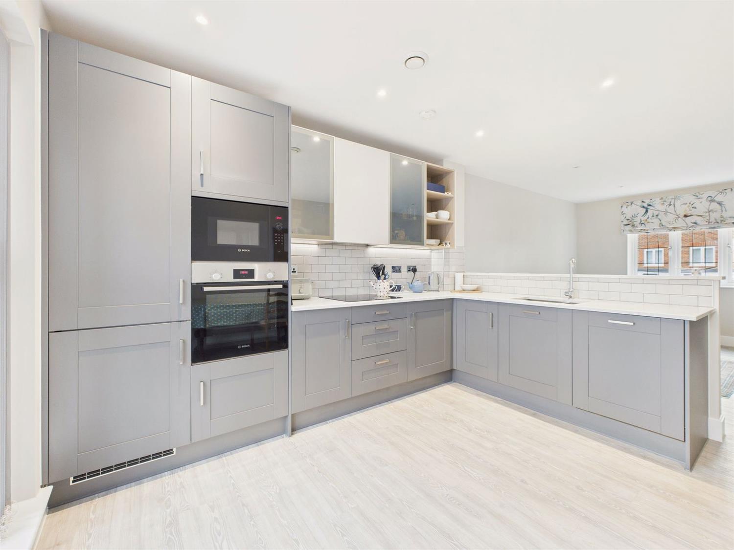 Open Plan Kitchen/Living RoomLiving room area with leaded double glazed side aspect, electric panel radiator, downlighting, opening to Kitchen Area with wide leaded double glazed side aspect, fitted in a range of base and wall mounted cupboards and drawers in grey Shaker style with complementing quartz worktop surfaces incorporating 1 1/2 bowl stainless steel sink with chromium monobloc tap, Bosch touch control induction hob with concealed filter hood over, high level oven and microwave oven, integrated fridge freezer and dishwasher, recycle drawer, LED pelmet lighting.