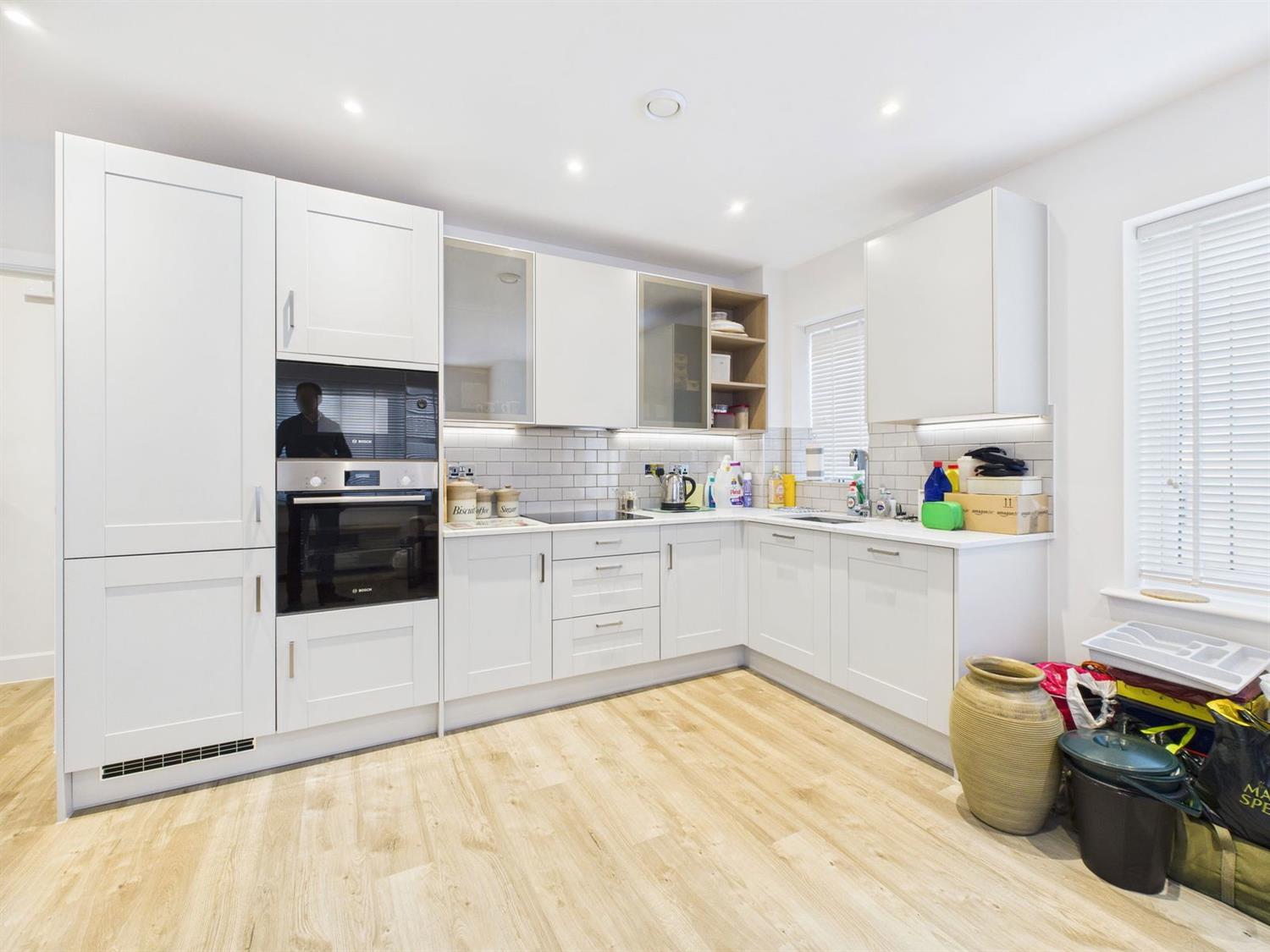 Open Plan Living Room and KitchenA bright and spacious dual-aspect room with attractive views over the central landscaped square of Highwood Village. The kitchen comprises a range of soft grey eye and base cabinets and drawers with complementary quartz worktops, Metro-tiled splashback, and glass-fronted display cabinets. High specification integrated appliances include an electric oven with convection oven/microwave above, four-burner induction hob with extractor, and a full-size dishwasher. There is a stainless steel one-and-a-half bowl inset sink with mixer tap, along with under-cabinet lighting.