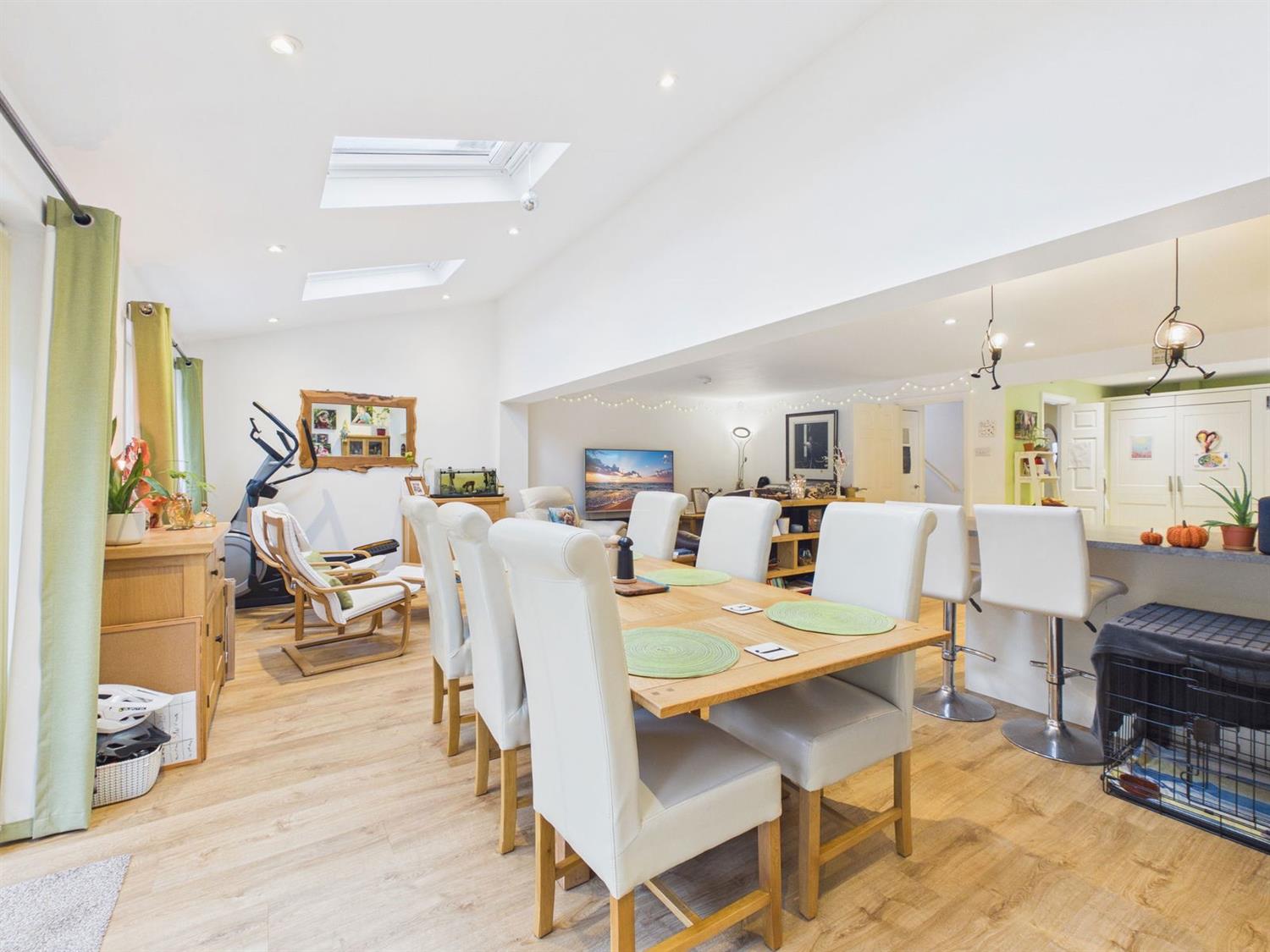 Forming part of the rear extension is this fabulous open plan living space which is wonderfully bright owning to glazed French doors, a large rear aspect window, and three Velux windows with remote solar powered blinds. The room has three defined areas for cooking, dining and relaxing. The recently fitted high specification kitchen comprises a range of stylish eye and base level cabinets and drawers with complementing worktops and upstands. Integrated appliances include an AEG full height fridge, an AEG full height freezer, Bosch dishwasher, a drinks fridge, and a tower extractor with space below for a Rangemaster cooker which could be included via separate negotiation. A continuation of the worktop forms a useful breakfast bar, while additional features include frosted glass display cabinets, built-in wine rack, open display shelving, under-cabinet lighting, and power points with USB charging, an enamel one-and-a-half bowl sink with mixer tap, corner carousel storage, pull-out larder, and recessed downlights. A side aspect window in the kitchen provides natural light, with a door leading back into the entrance hall.