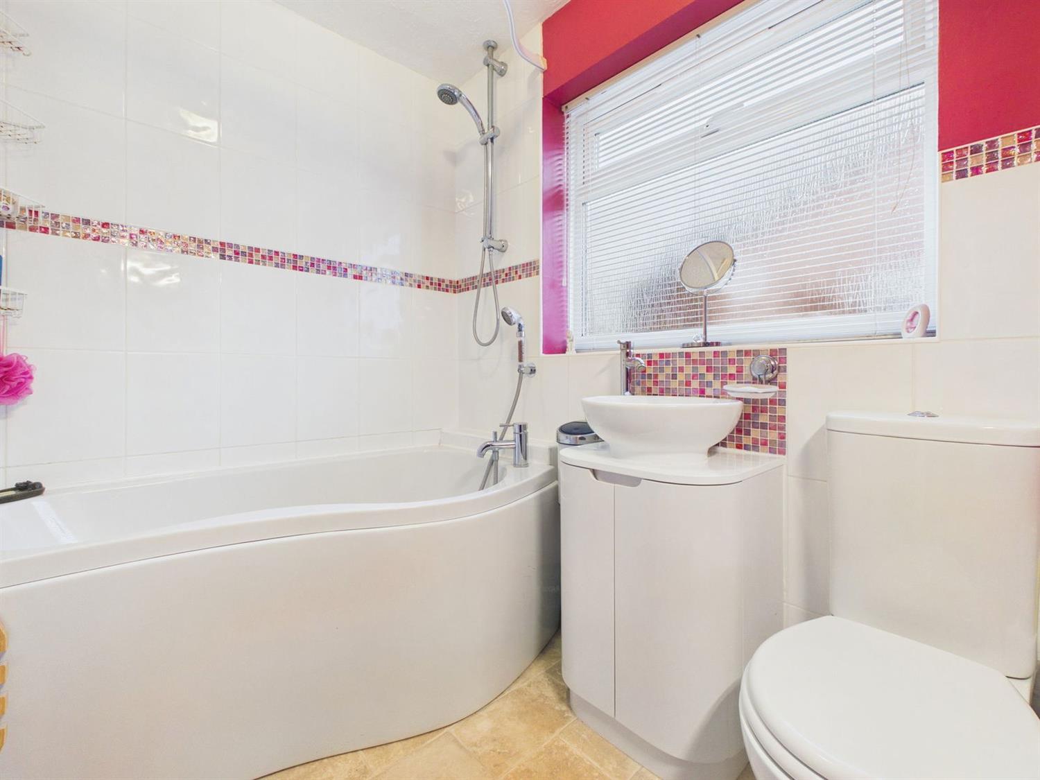Family BathroomA modern family bathroom suite comprising a P-shaped enclosed panel bath with mixer tap, handheld shower attachment and separate bluetooth wall-mounted shower, vanity worktop mounted wash hand basin with mosaic tiled splashback and storage beneath, a low-level WC with dual flush, a heated towel radiator, wall-mounted vanity light with shaver point, extractor fan, and an obscured side aspect window.