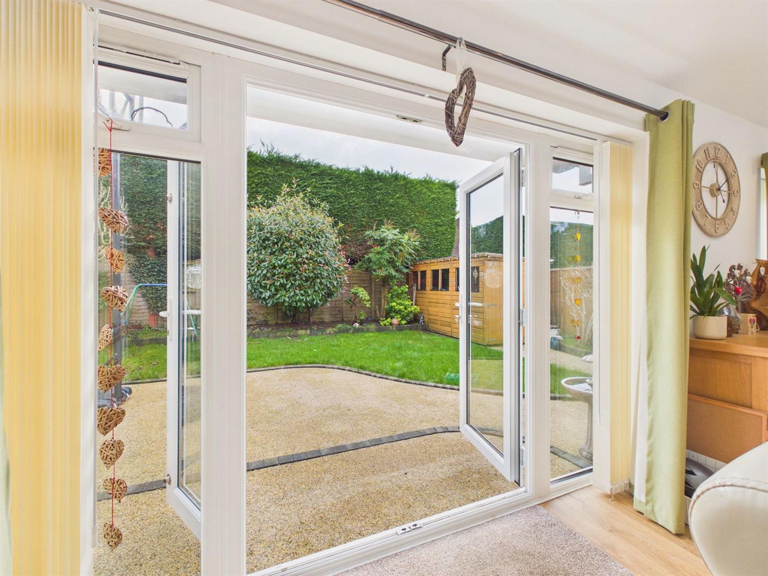 To the rear, the garden is wonderfully secluded, benefiting from its position within the road and a tall evergreen hedge forming a natural backdrop. A well drained resin gravel patio adjoins the rear of the house, creating an ideal entertaining space, with grey bullnose setts forming a raised border and pathway leading to the side of the house. Mature shrubs and trees are planted around the edge of the lawn and patio, and there is a timber shed.