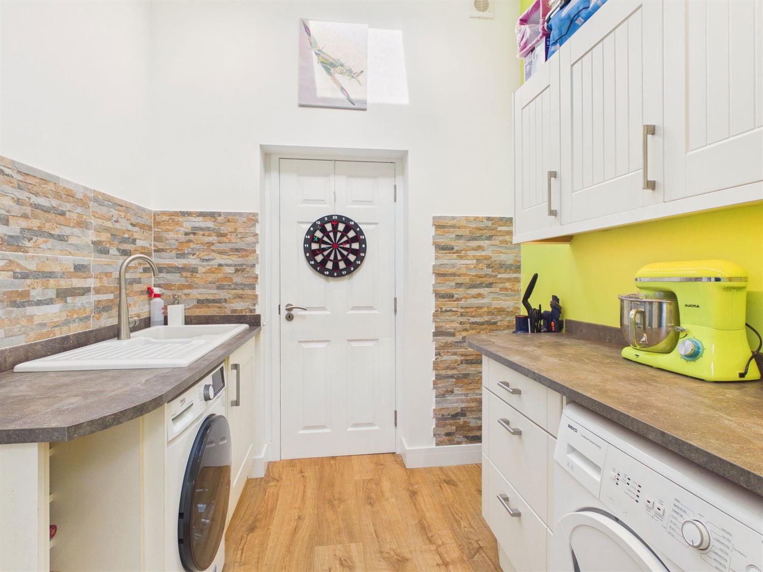 Utility RoomA useful utility space fitted with a range of eye and base level cabinets and drawers with complementing worktops and upstands. Features include an enamel one-and-a-half bowl sink with mixer tap, space and plumbing for a washing machine, space for a tumble dryer, two built-in wine racks, downlighting, extractor fan, and a Velux window with solar powered blinds. Doors provides access to the rear garden, garage, and open plan living space.