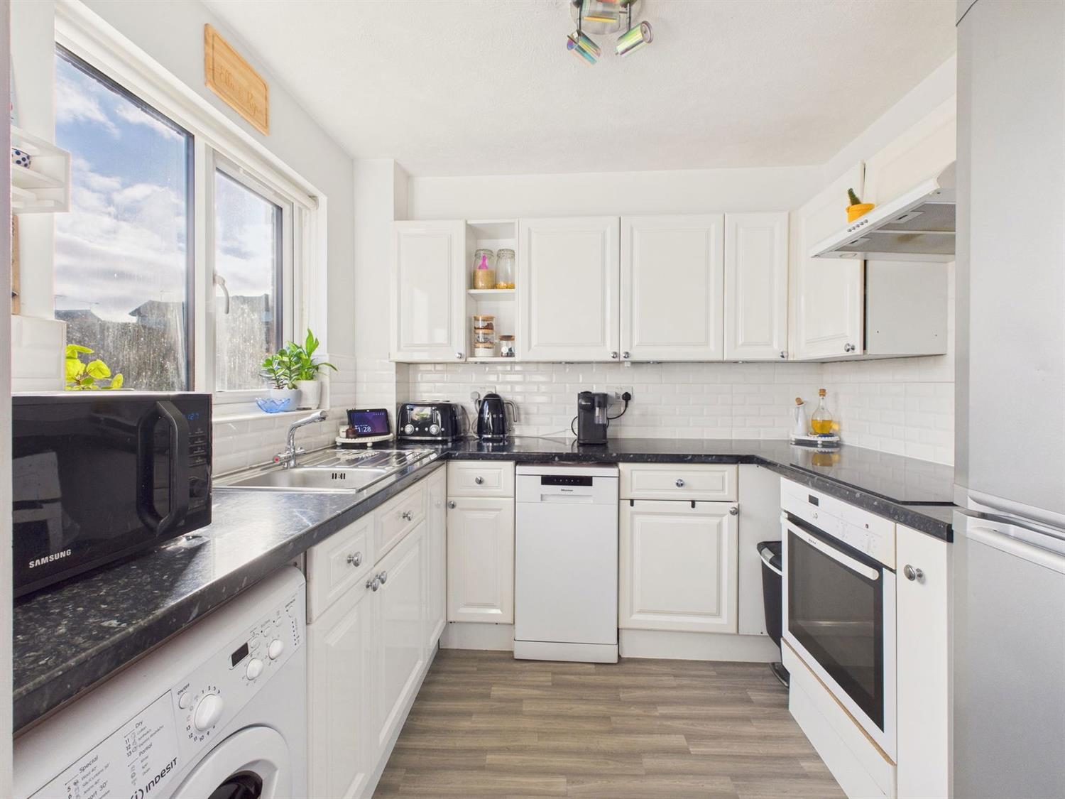 KitchenDouble glazed rear aspect. Fitted with a range of base and wall mounted cupboards and drawers in white high gloss finish, complimenting work top surfaces incorporating a single drainer stainless steel sink with chromium monobloc tap, Hotpoint touch control electric hob with electric oven under and filter hood over. Space for a fridge/freezer, space and plumbing for a slimline dishwasher and washing machine. White brick styled splashback, pelmet lights, extractor fan, vinyl flooring.