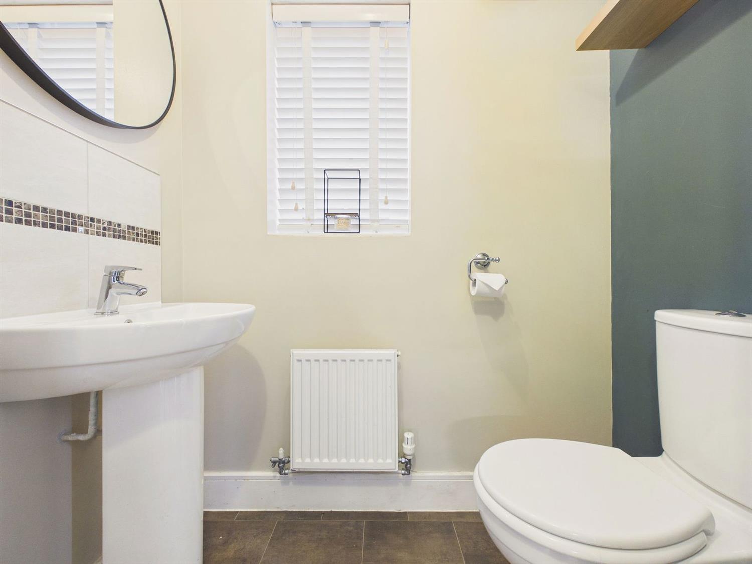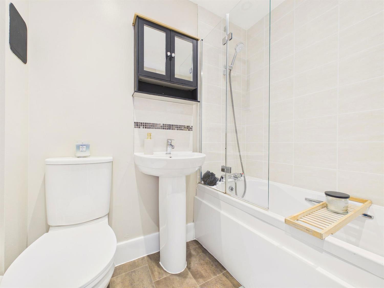 BathroomA modern bathroom suite comprising an enclosed panel bath with mixer taps and shower over, pedestal wash hand basin with mixer tap, and a low-level WC with dual flush. Additional features include a shaver point, heated towel radiator, downlighting, and extractor fan, and a heater.