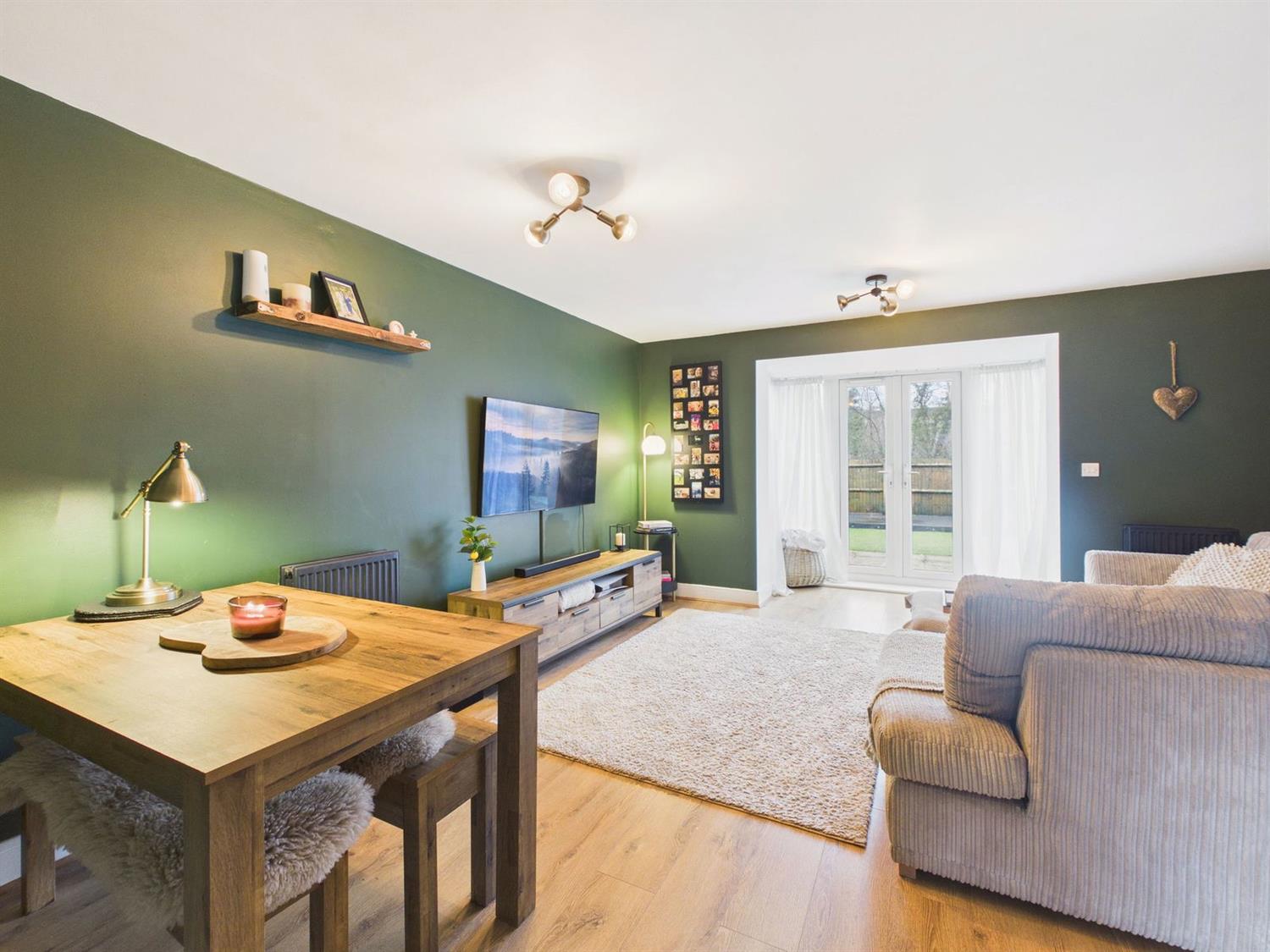 KitchenThe kitchen comprises a range of eye and base level cabinets and drawers with complementing wood-effect worktops. There is a stainless steel sink and drainer with mixer tap, a front aspect window, downlighting, under cabinet lighting, and tile-effect flooring. Integrated appliances include a fridge/freezer, electric oven with four-burner gas hob and concealed extractor over, a dishwasher, and a washing machine. A cupboard houses the gas-fired boiler.
