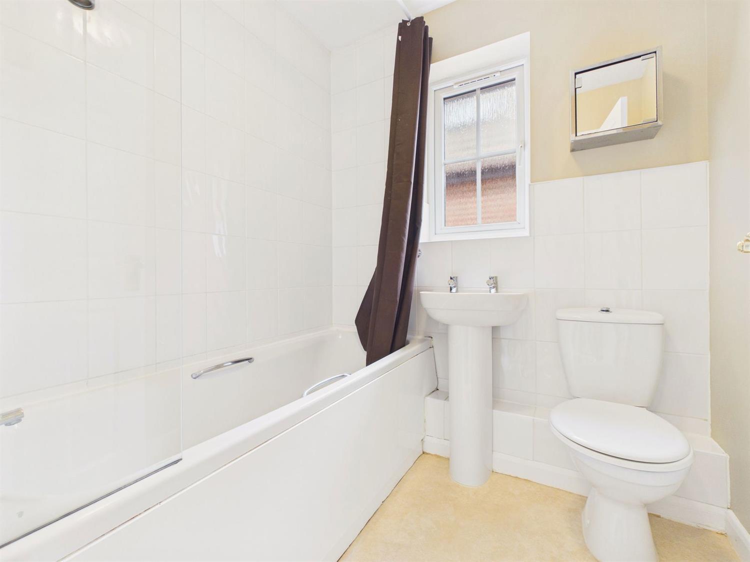 BathroomFitted with a modern white suite comprising an enclosed panel bath with mixer taps and electric shower over, low-level WC with dual flush, and pedestal wash hand basin. Heated towel radiator, shaver point, and obscured side aspect window.