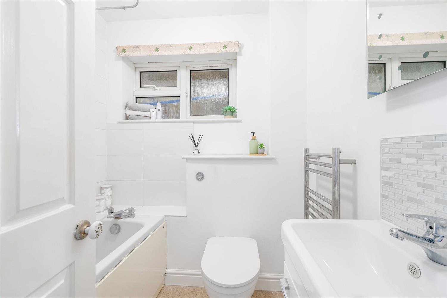 BathroomA modern bathroom comprising a panel enclosed bath with mixer tap and shower over, low-level WC with dual flush, vanity wash hand basin with storage beneath, heated towel radiator, and an obscured side aspect window.