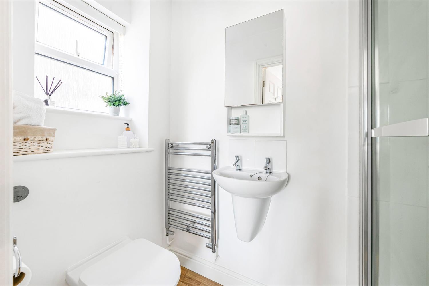 Ensuite Shower RoomA contemporary suite comprising a shower with concealed mixer and handheld attachment, low-level WC with dual flush, wall-hung wash hand basin, heated towel radiator, obscured side aspect window, and extractor fan.