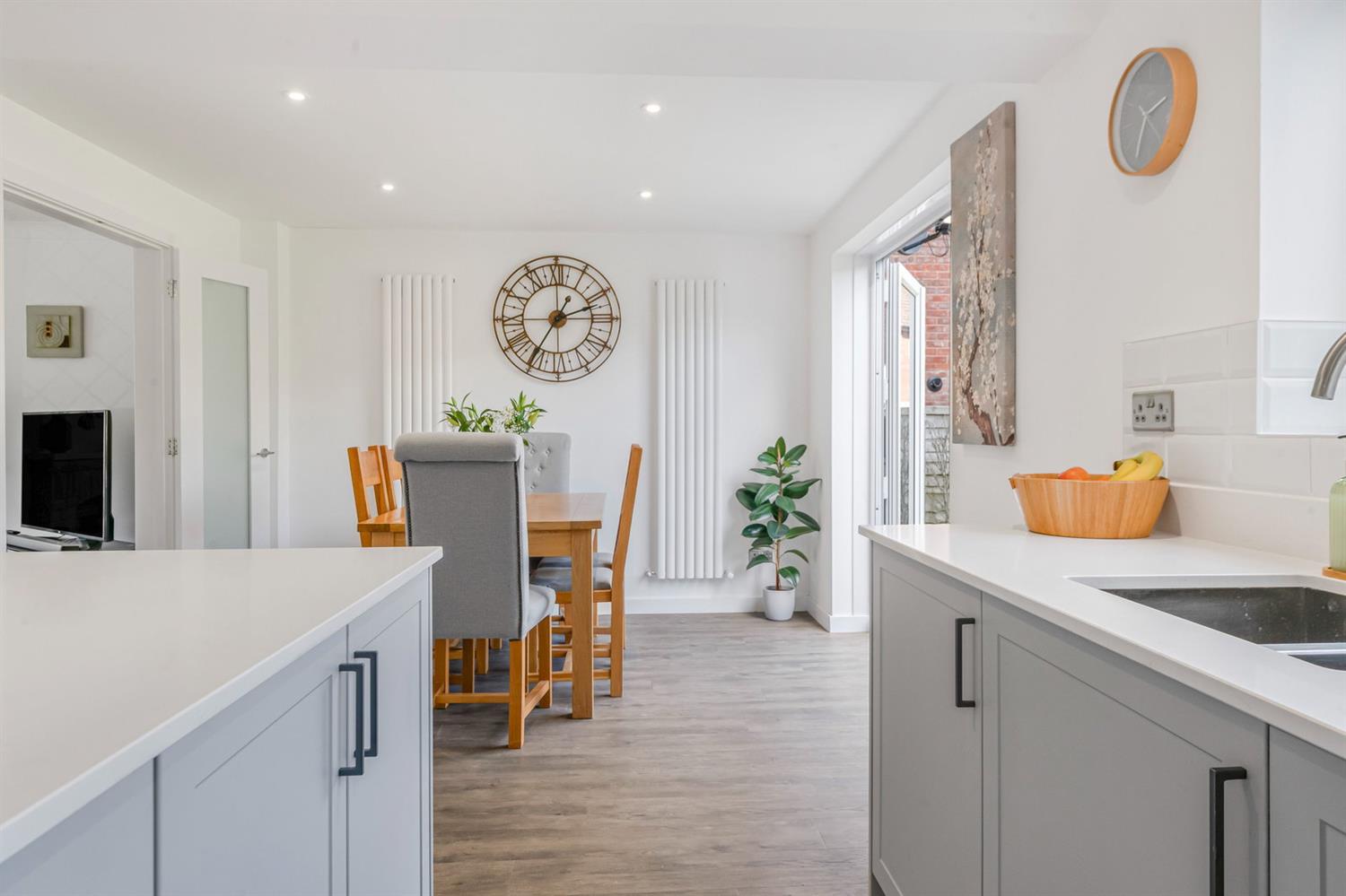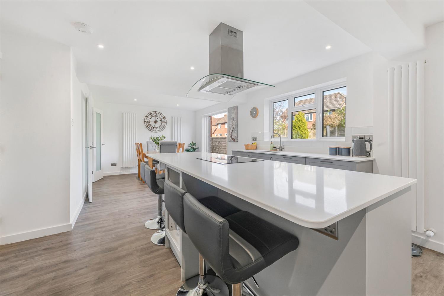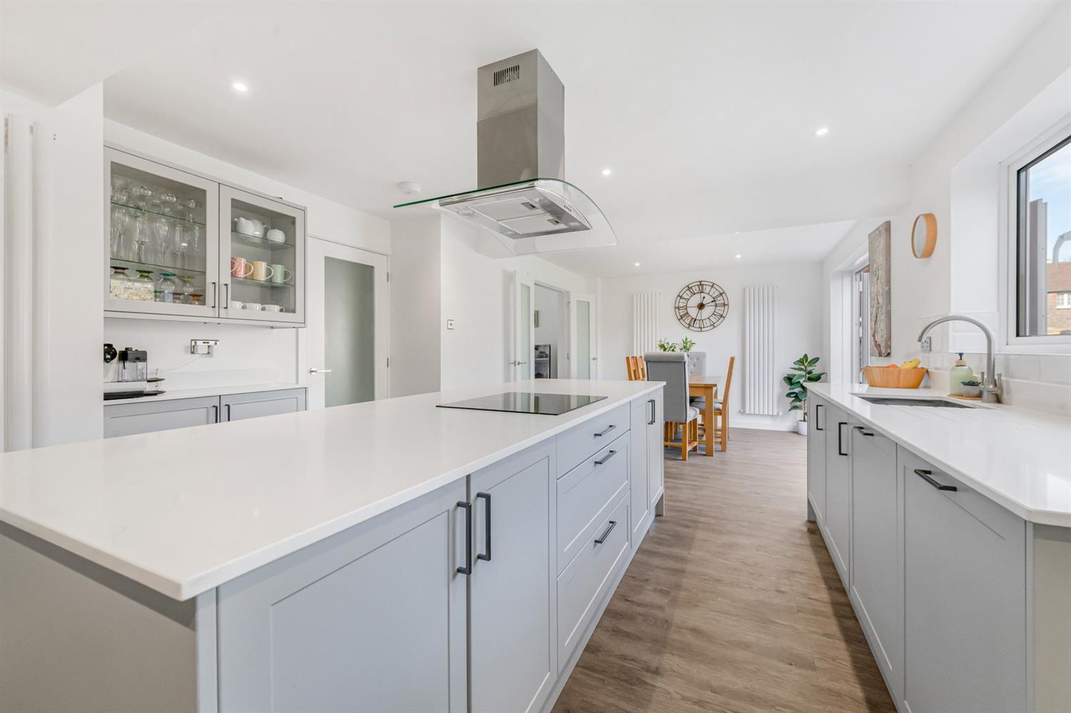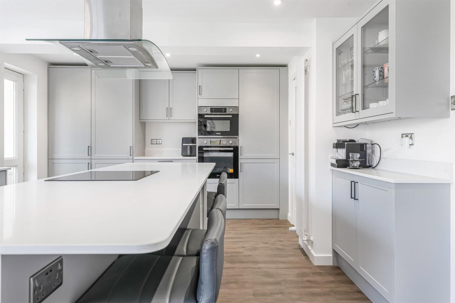 Open Plan Kitchen/Dining RoomFormerly two rooms, this impressive open plan space now forms the hub of the home, spanning the full width of the property. The recently refitted kitchen comprises a comprehensive range of eye and base level cabinets in a soft grey finish, complemented by marbled quartz worktops, and an inset stainless steel one and a half bowl sink with routed drainer and mixer tap. High specification integrated appliances include a four-burner induction hob with extractor over, electric oven with convection microwave oven above, full-height fridge, low-level freezer, and a dishwasher. Thoughtfully designed storage includes corner carousel cupboards, a full size pull out larder, and a pull-out bin drawer. A central island provides additional preparation space, and a continuation of worktops creates breakfast bar seating. The kitchen is open to the dining area, which comfortably accommodates a large table and chairs and has French doors opening onto the rear garden. Additional features include four vertical radiators and recessed spotlighting. Doors lead to the sunroom and utility room.