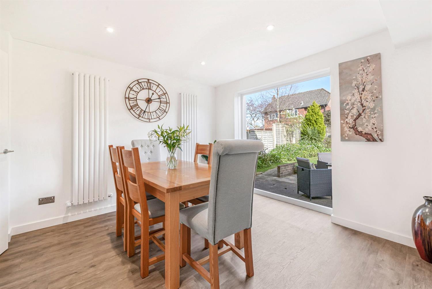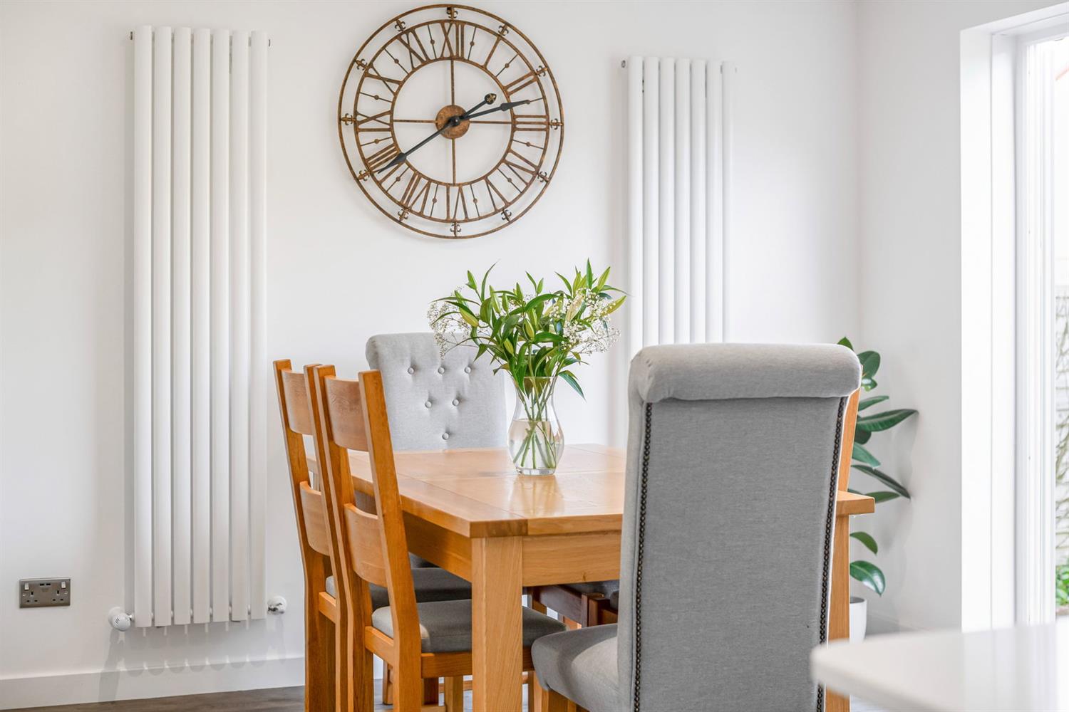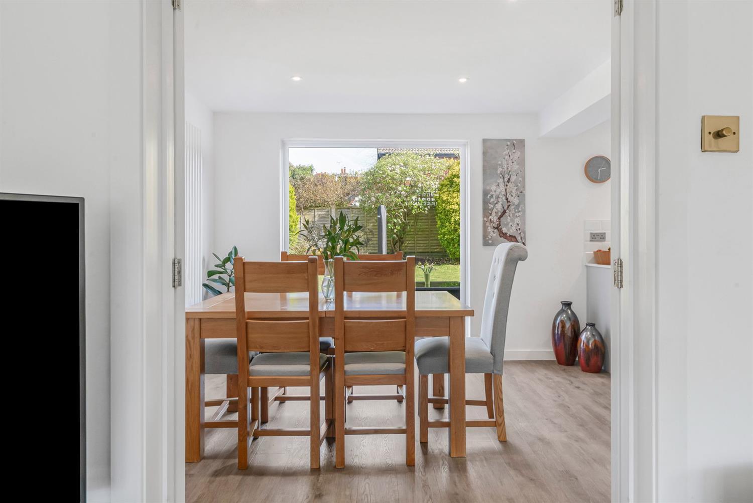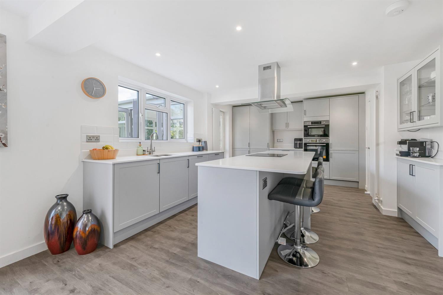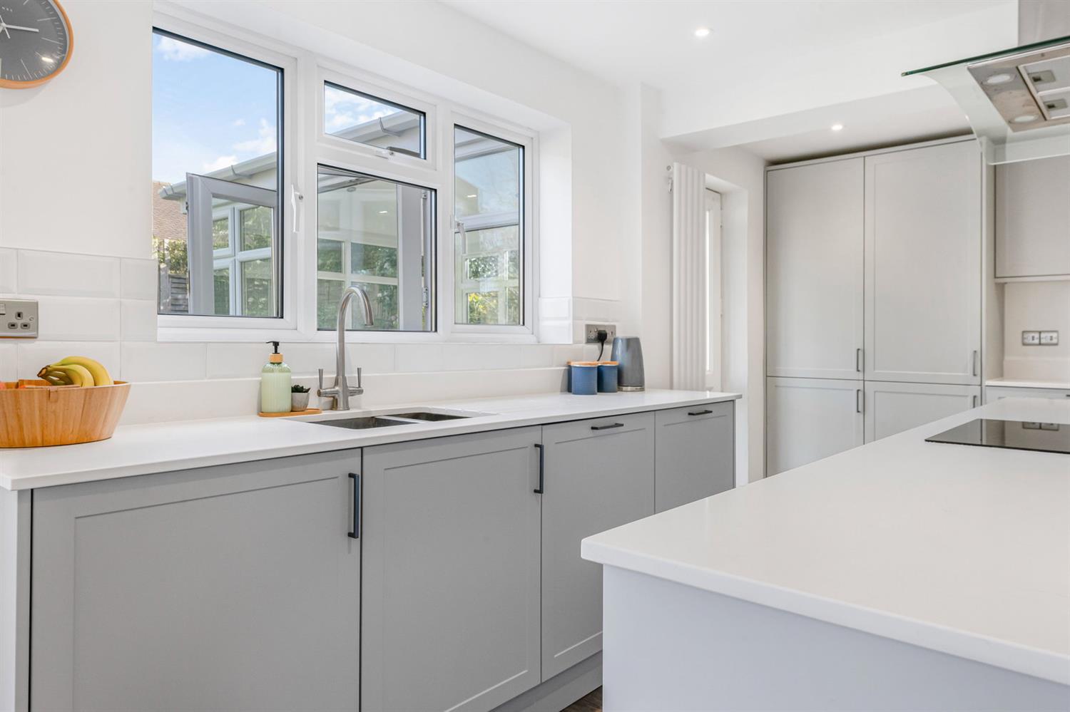 Open Plan Kitchen/Dining RoomFormerly two rooms, this impressive open plan space now forms the hub of the home, spanning the full width of the property. The recently refitted kitchen comprises a comprehensive range of eye and base level cabinets in a soft grey finish, complemented by marbled quartz worktops, and an inset stainless steel one and a half bowl sink with routed drainer and mixer tap. High specification integrated appliances include a four-burner induction hob with extractor over, electric oven with convection microwave oven above, full-height fridge, low-level freezer, and a dishwasher. Thoughtfully designed storage includes corner carousel cupboards, a full size pull out larder, and a pull-out bin drawer. A central island provides additional preparation space, and a continuation of worktops creates breakfast bar seating. The kitchen is open to the dining area, which comfortably accommodates a large table and chairs and has French doors opening onto the rear garden. Additional features include four vertical radiators and recessed spotlighting. Doors lead to the sunroom and utility room.