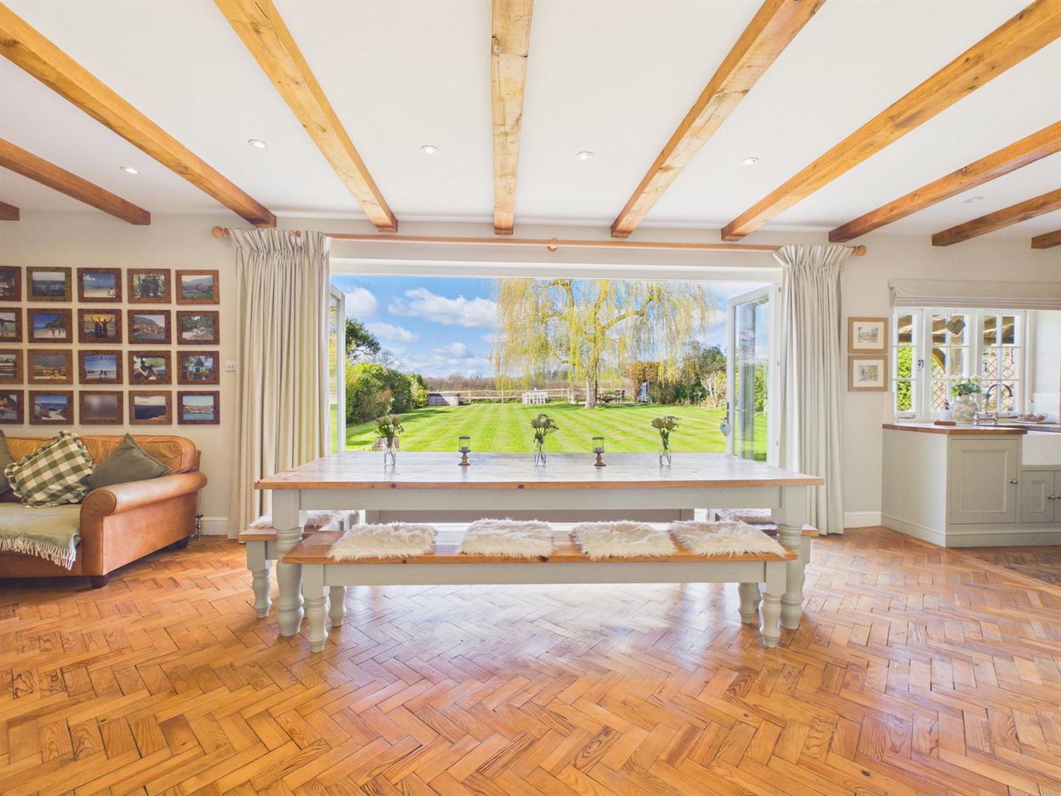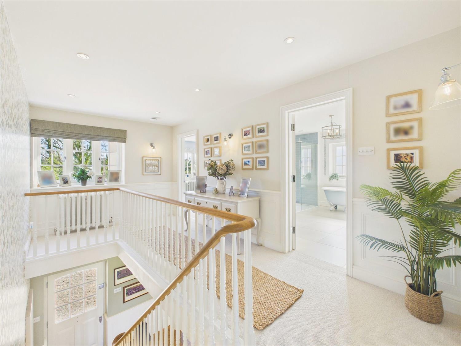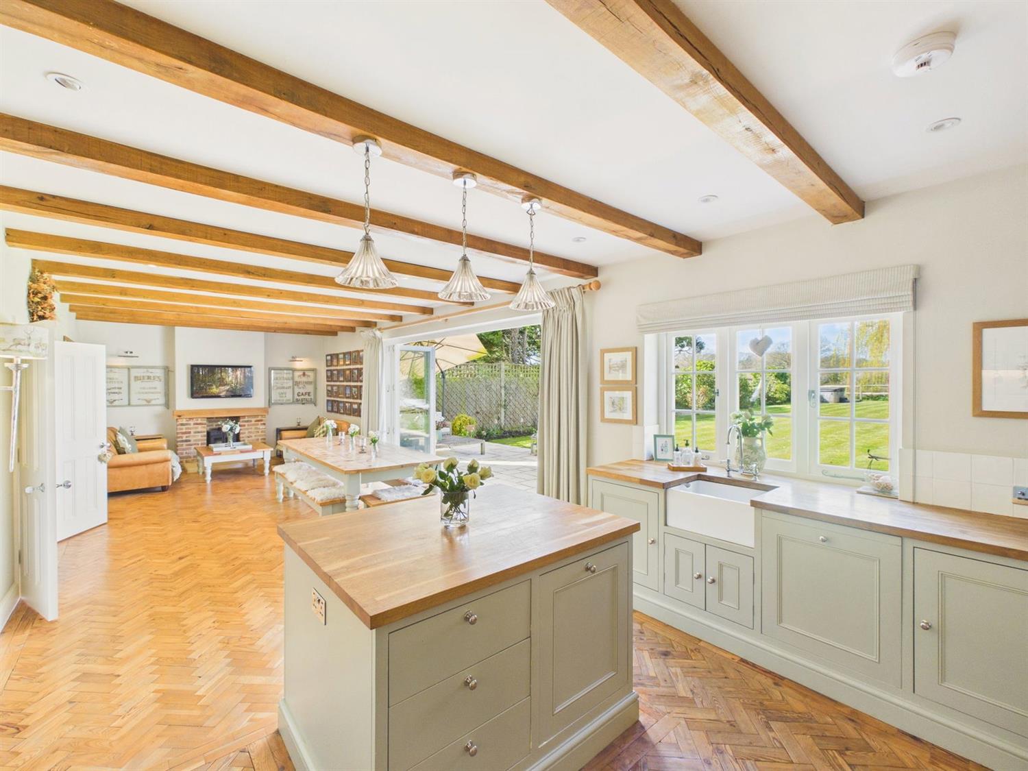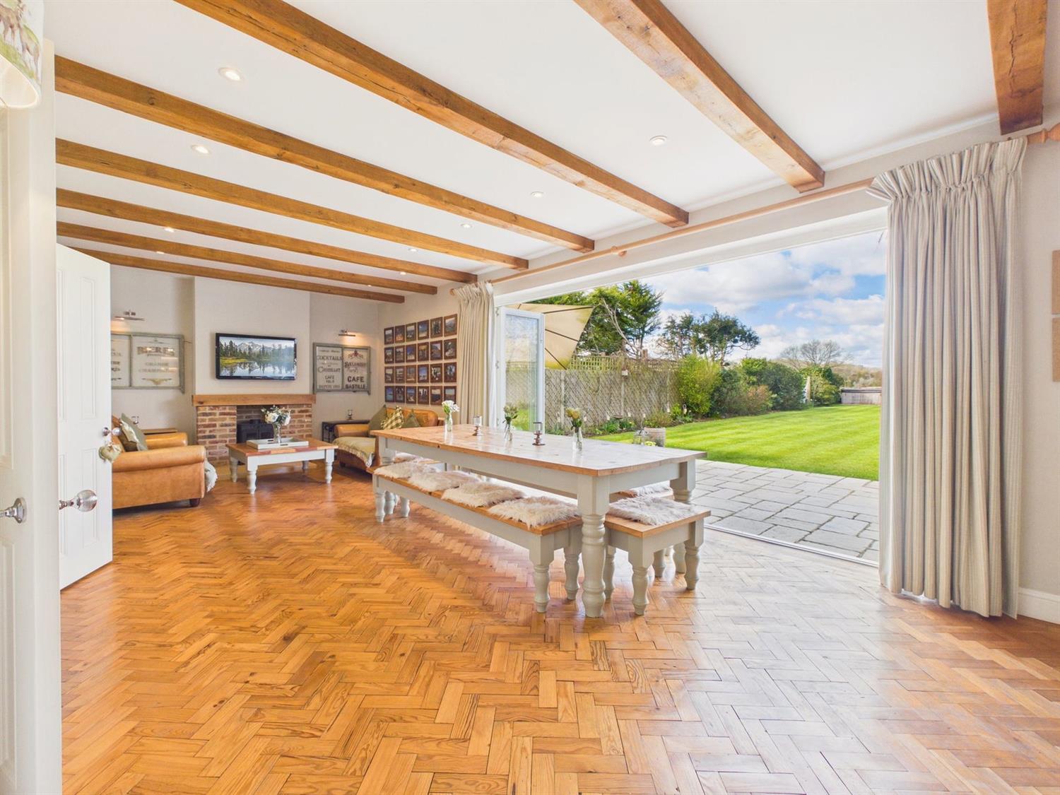 Originally a single-storey home, the property has been completely transformed into a substantial and highly versatile family home, with accommodation arranged over three floors and finished to an incredible standard throughout. Upon entering the home, an impressive entrance hall with herringbone block flooring opens through double doors which perfectly frame the outstanding southerly views beyond, while the rear of the house opens beautifully via almost 5m of folding doors from the open-plan kitchen, seamlessly connecting the interior with the garden. This open plan room spans nearly the entire width of the home with a snug, large dining space, and bespoke in-frame farmhouse style kitchen, whilst a practical utility and boot room keep the unsightly workings of a family home out of view. The formal sitting room is flooded with natural light from two large box bay windows, whilst exposed timber ceiling joists and a stunning exposed brick central inglenook fireplace with oak mantle and wood burning stove give a sense of character in this newly created home. Completing the ground floor is an evening lounge, downstairs cloakroom and study. On the first floor there is a fabulous principal bedroom suite with dressing room and ensuite bathroom, a guest bedroom with access to the first-floor bathroom suite, two further ensuite bedrooms, and the fifth bedroom. The top floor is highly versatile and provides an ideal self-contained space for guests, a live in nanny, or older children. With a bright landing/study space, a lounge/games room, an ensuite bedroom, a further bedroom/gym, and a w.c which could become a further bathroom, or sauna as the current owners had planned.