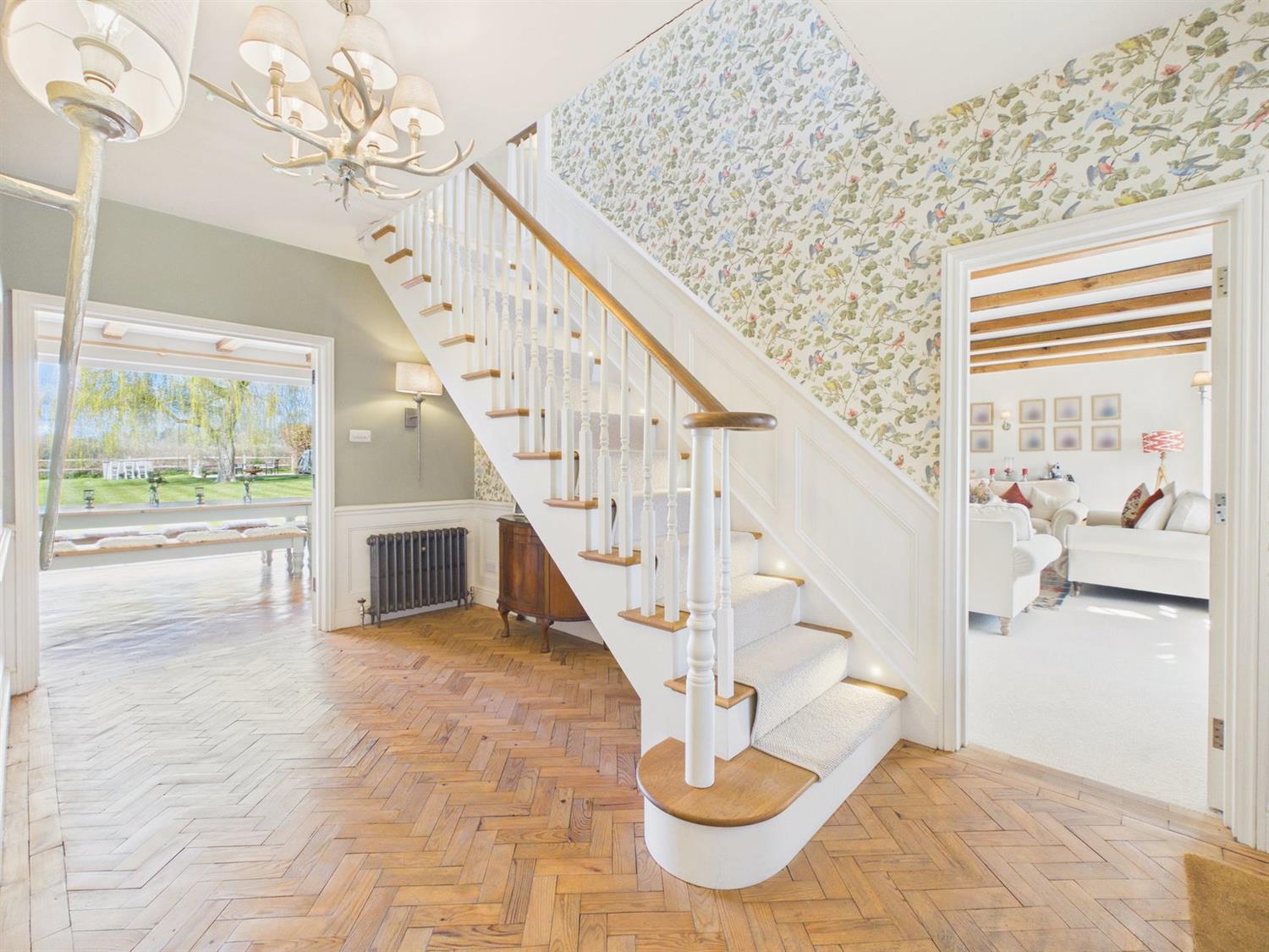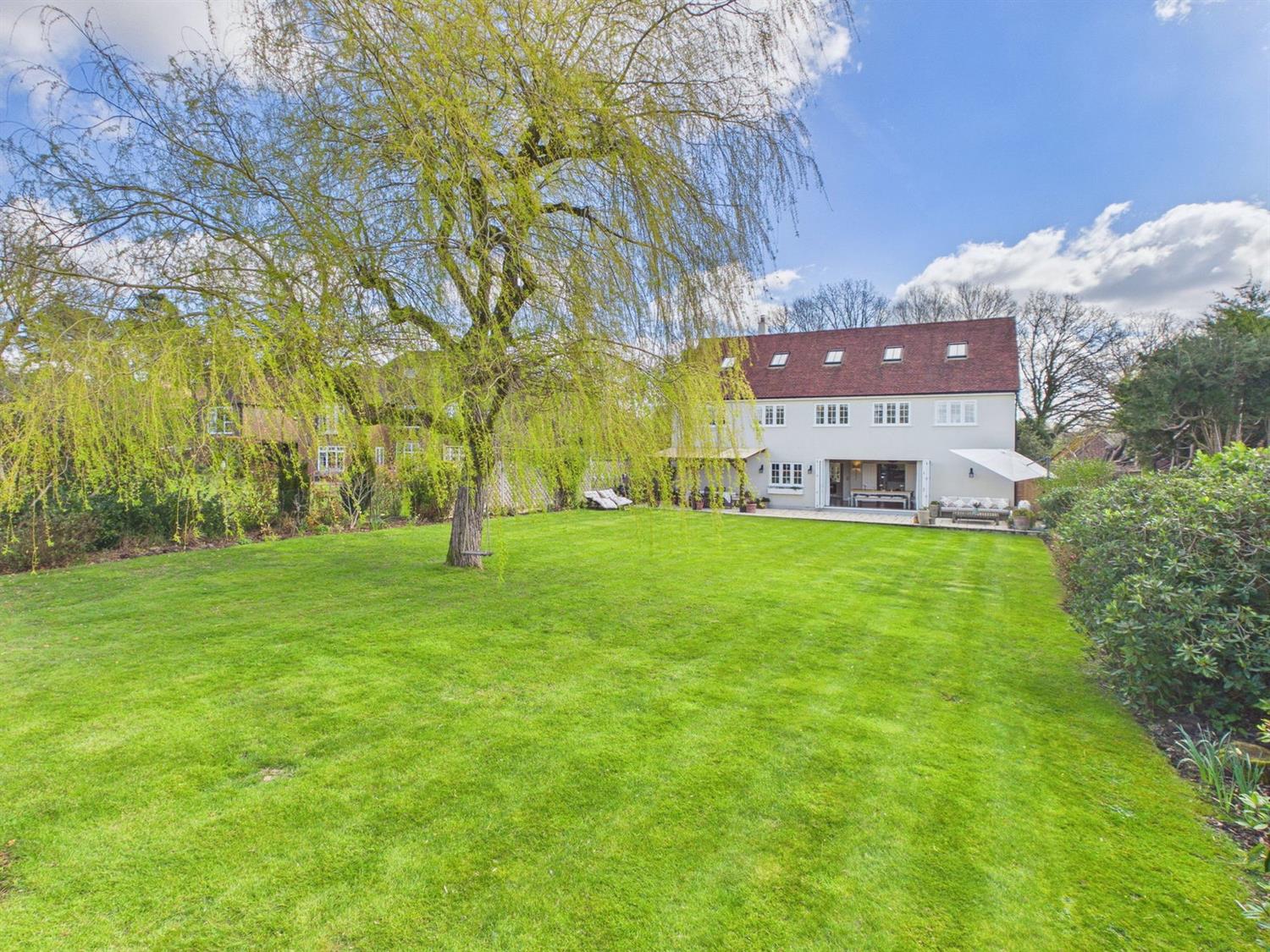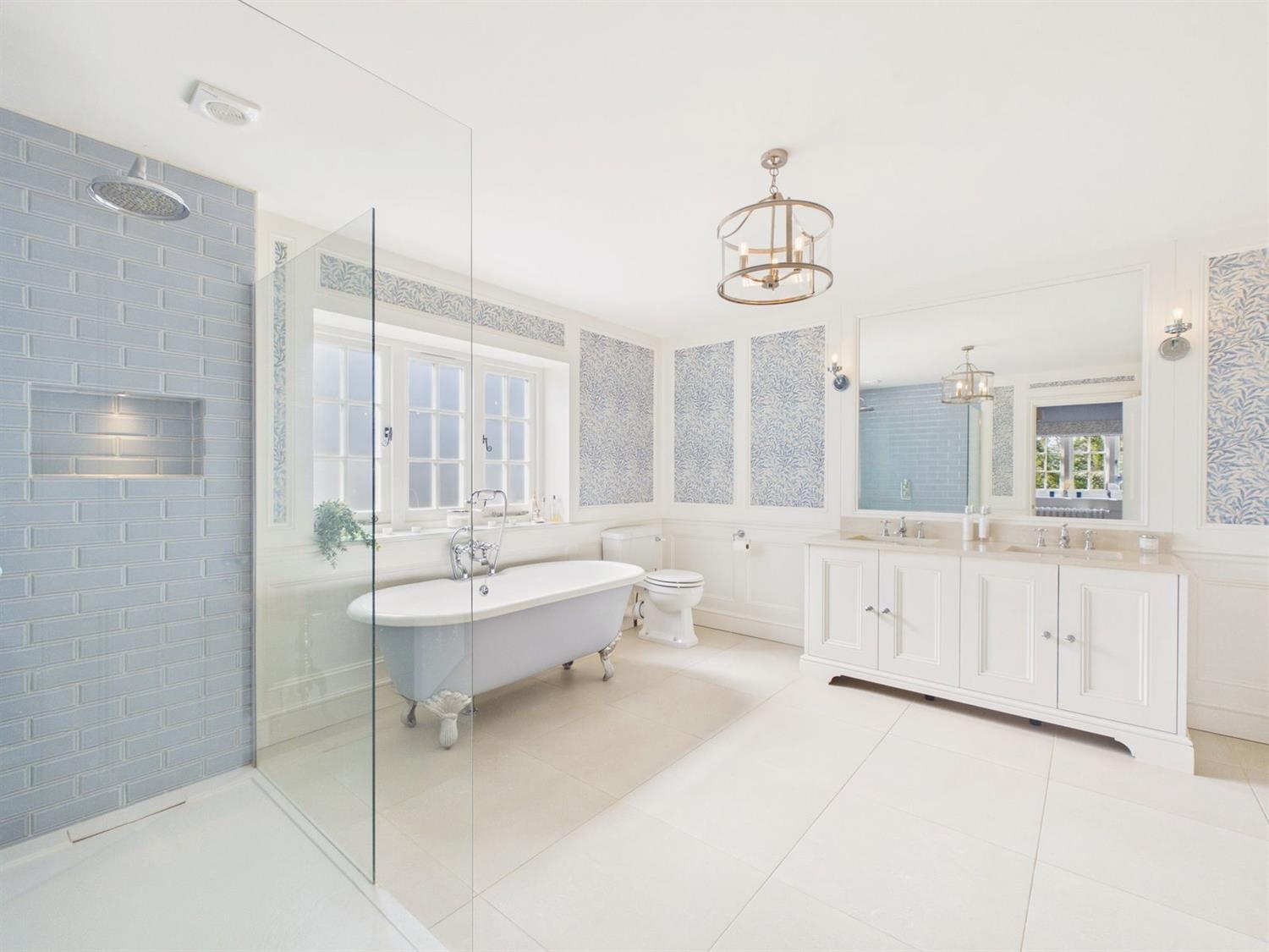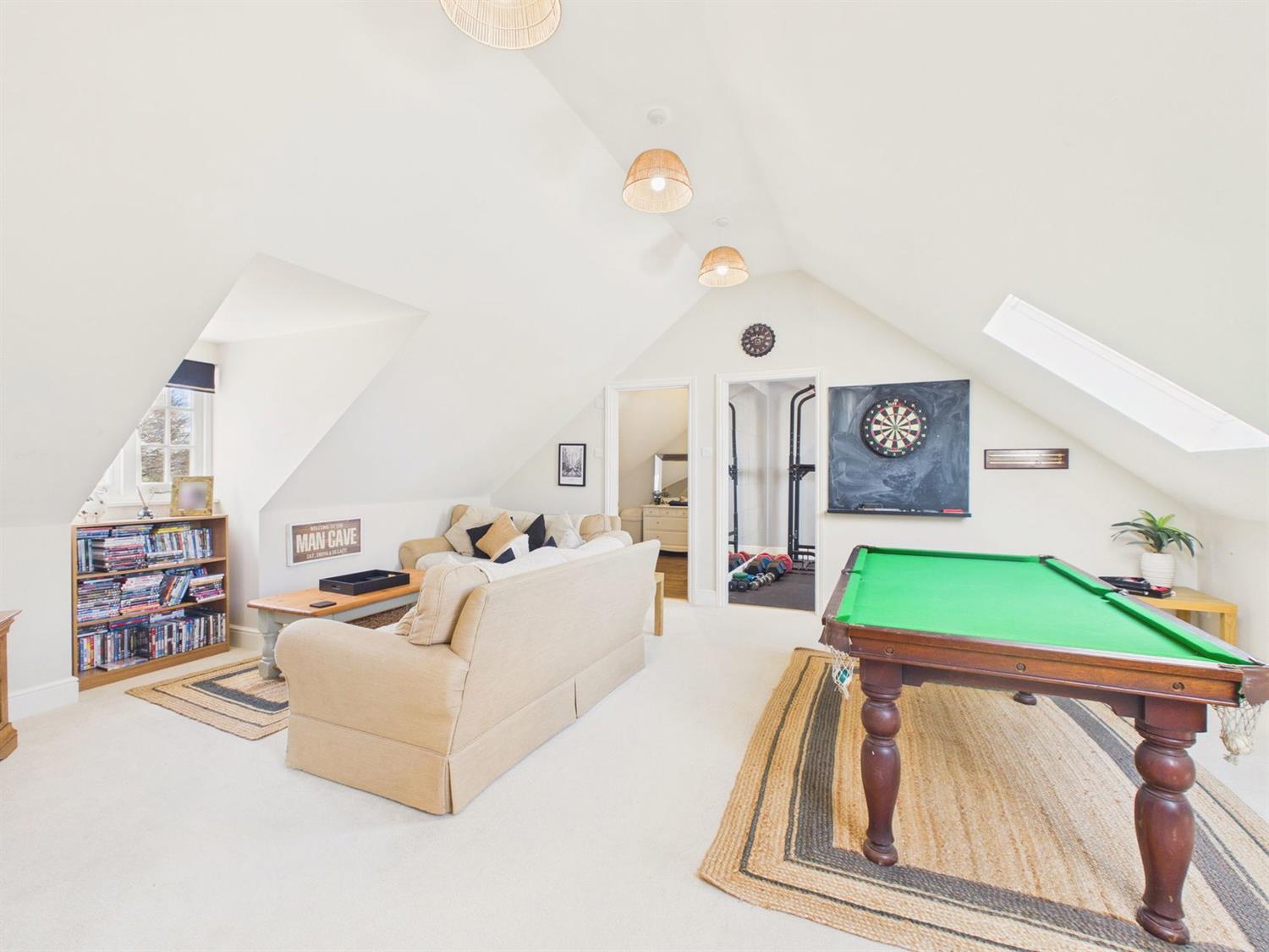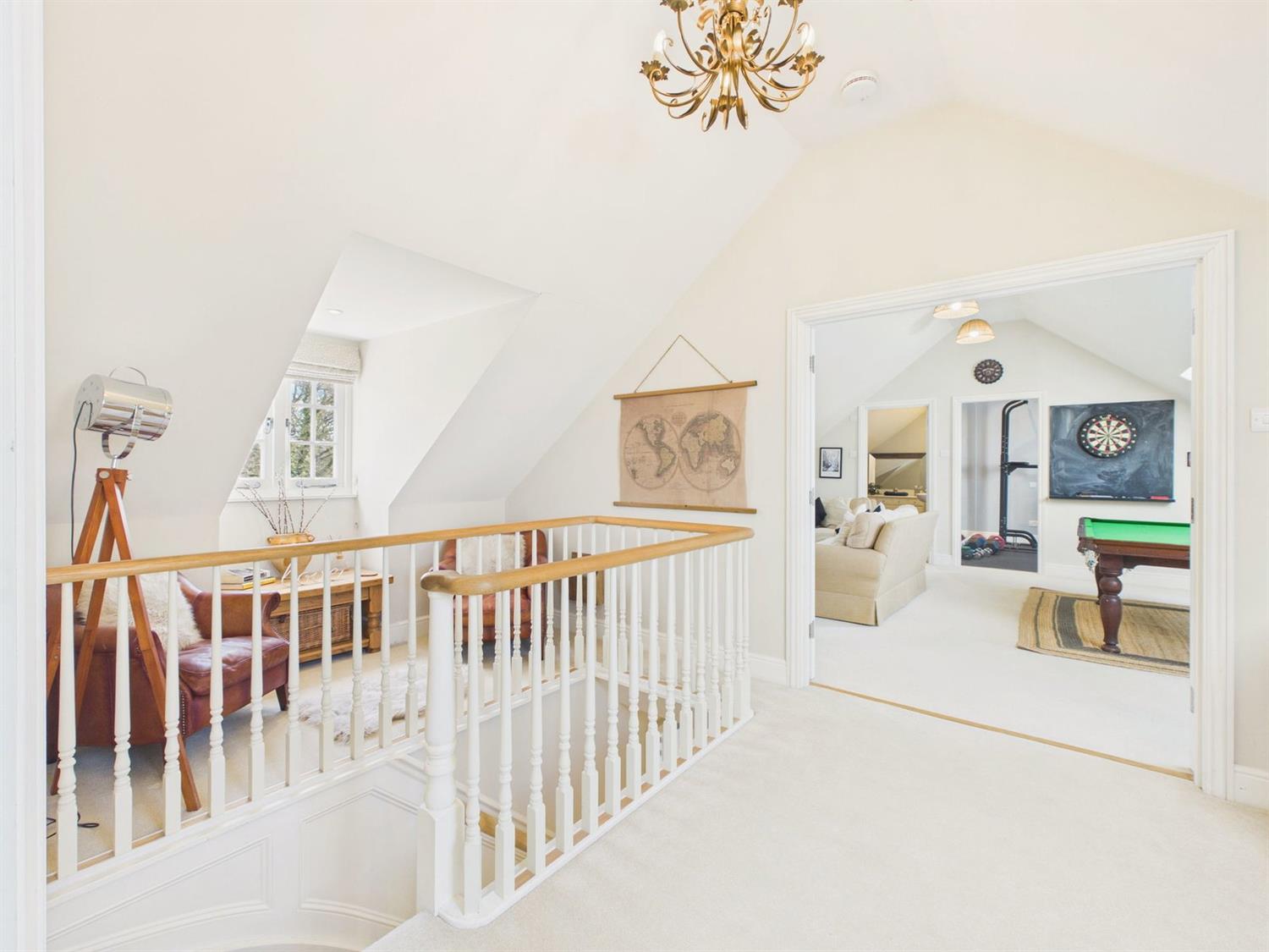Originally a single-storey home, the property has been completely transformed into a substantial and highly versatile family home, with accommodation arranged over three floors and finished to an incredible standard throughout. Upon entering the home, an impressive entrance hall with herringbone block flooring opens through double doors which perfectly frame the outstanding southerly views beyond, while the rear of the house opens beautifully via almost 5m of folding doors from the open-plan kitchen, seamlessly connecting the interior with the garden. This open plan room spans nearly the entire width of the home with a snug, large dining space, and bespoke in-frame farmhouse style kitchen, whilst a practical utility and boot room keep the unsightly workings of a family home out of view. The formal sitting room is flooded with natural light from two large box bay windows, whilst exposed timber ceiling joists and a stunning exposed brick central inglenook fireplace with oak mantle and wood burning stove give a sense of character in this newly created home. Completing the ground floor is an evening lounge, downstairs cloakroom and study. On the first floor there is a fabulous principal bedroom suite with dressing room and ensuite bathroom, a guest bedroom with access to the first-floor bathroom suite, two further ensuite bedrooms, and the fifth bedroom. The top floor is highly versatile and provides an ideal self-contained space for guests, a live in nanny, or older children. With a bright landing/study space, a lounge/games room, an ensuite bedroom, a further bedroom/gym, and a w.c which could become a further bathroom, or sauna as the current owners had planned.
