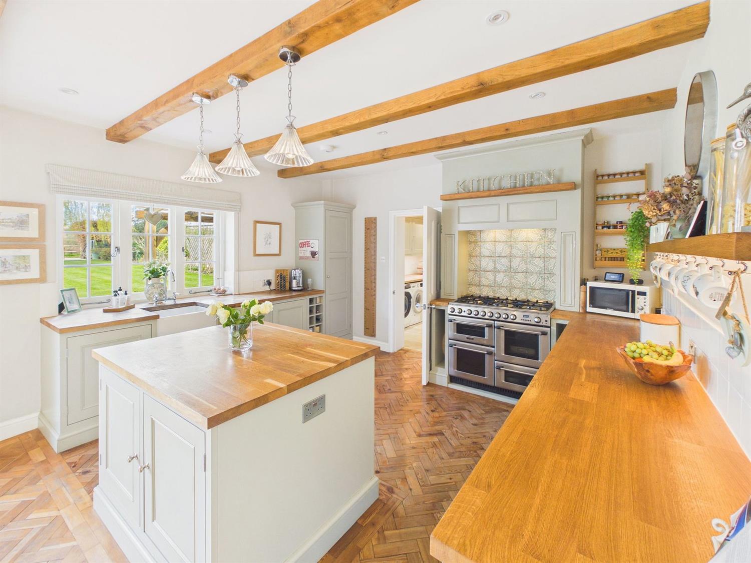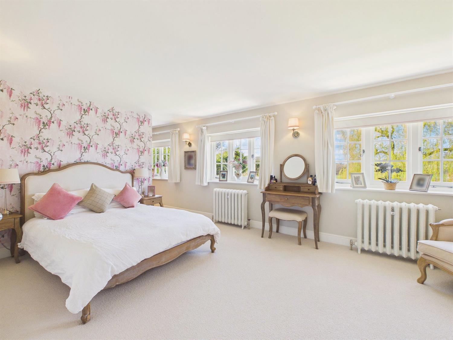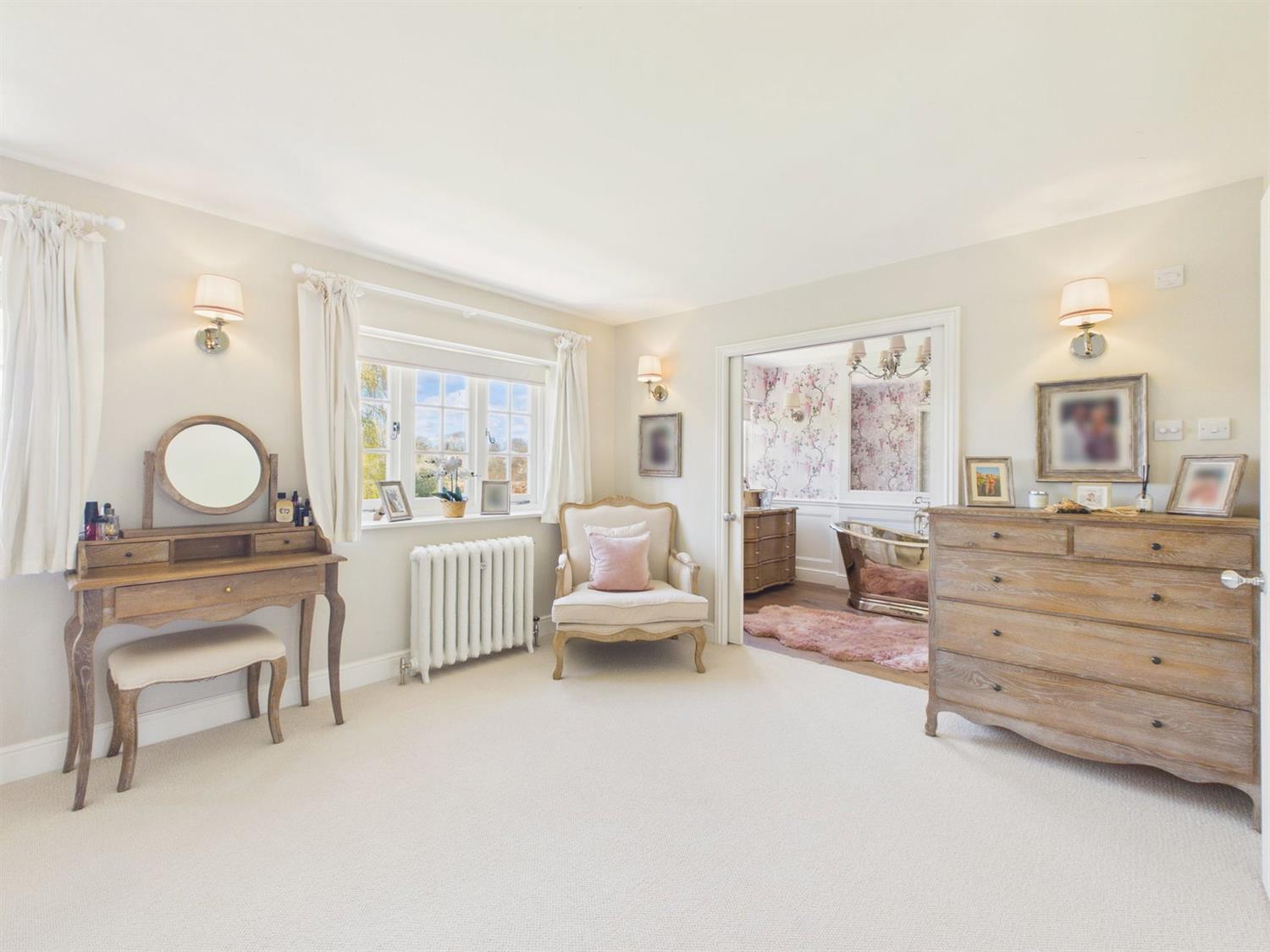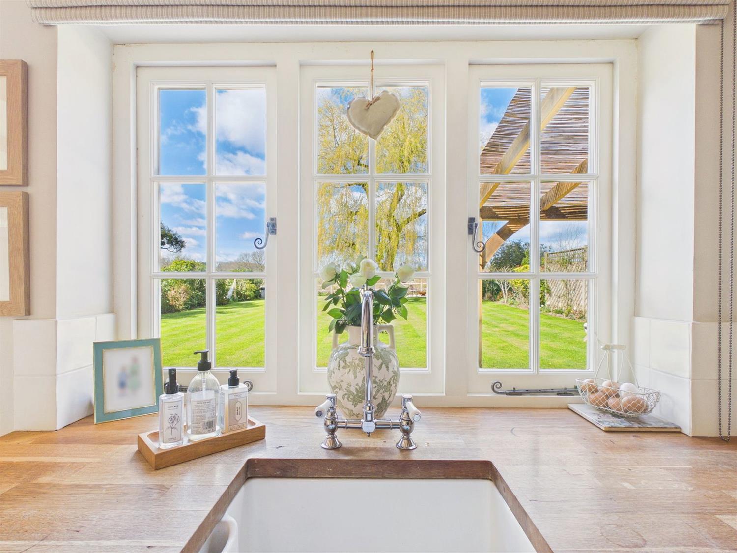 Originally a single-storey home, the property has been completely transformed into a substantial and highly versatile family home, with accommodation arranged over three floors and finished to an incredible standard throughout. Upon entering the home, an impressive entrance hall with herringbone block flooring opens through double doors which perfectly frame the outstanding southerly views beyond, while the rear of the house opens beautifully via almost 5m of folding doors from the open-plan kitchen, seamlessly connecting the interior with the garden. This open plan room spans nearly the entire width of the home with a snug, large dining space, and bespoke in-frame farmhouse style kitchen, whilst a practical utility and boot room keep the unsightly workings of a family home out of view. The formal sitting room is flooded with natural light from two large box bay windows, whilst exposed timber ceiling joists and a stunning exposed brick central inglenook fireplace with oak mantle and wood burning stove give a sense of character in this newly created home. Completing the ground floor is an evening lounge, downstairs cloakroom and study. On the first floor there is a fabulous principal bedroom suite with dressing room and ensuite bathroom, a guest bedroom with access to the first-floor bathroom suite, two further ensuite bedrooms, and the fifth bedroom. The top floor is highly versatile and provides an ideal self-contained space for guests, a live in nanny, or older children. With a bright landing/study space, a lounge/games room, an ensuite bedroom, a further bedroom/gym, and a w.c which could become a further bathroom, or sauna as the current owners had planned.