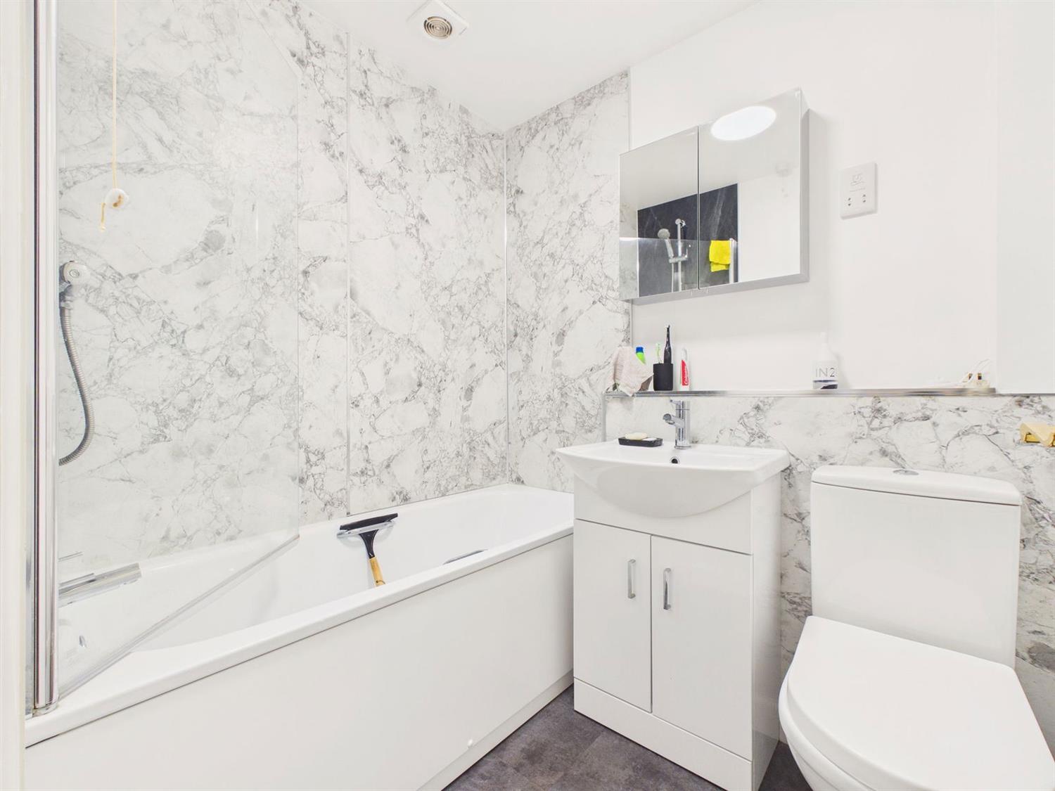 BathroomMatching suite comprising panelled bath with mixer tap and shower attachment, pedestal wash hand basin with mixer tap, back-to-wall w.c, radiator, extractor fan and part tiled walls.