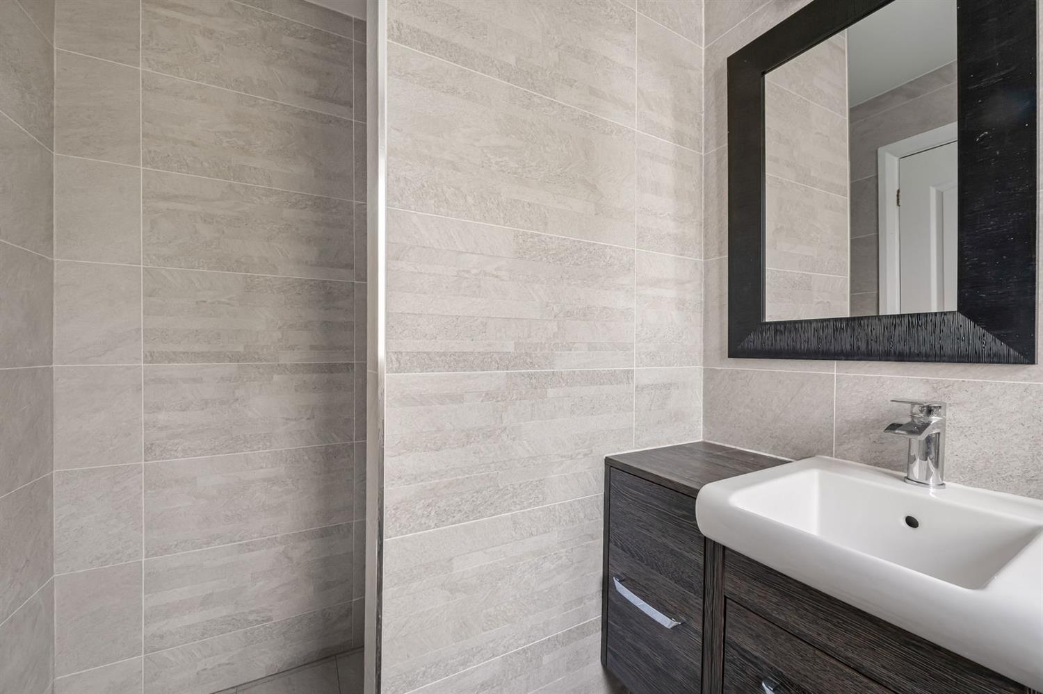 Ensuite Shower RoomFitted with an oversized walk-in shower, concealed mixer, low-level WC, wall-hung vanity unit, heated towel rail, full tiling, rear aspect window, and downlighting.
