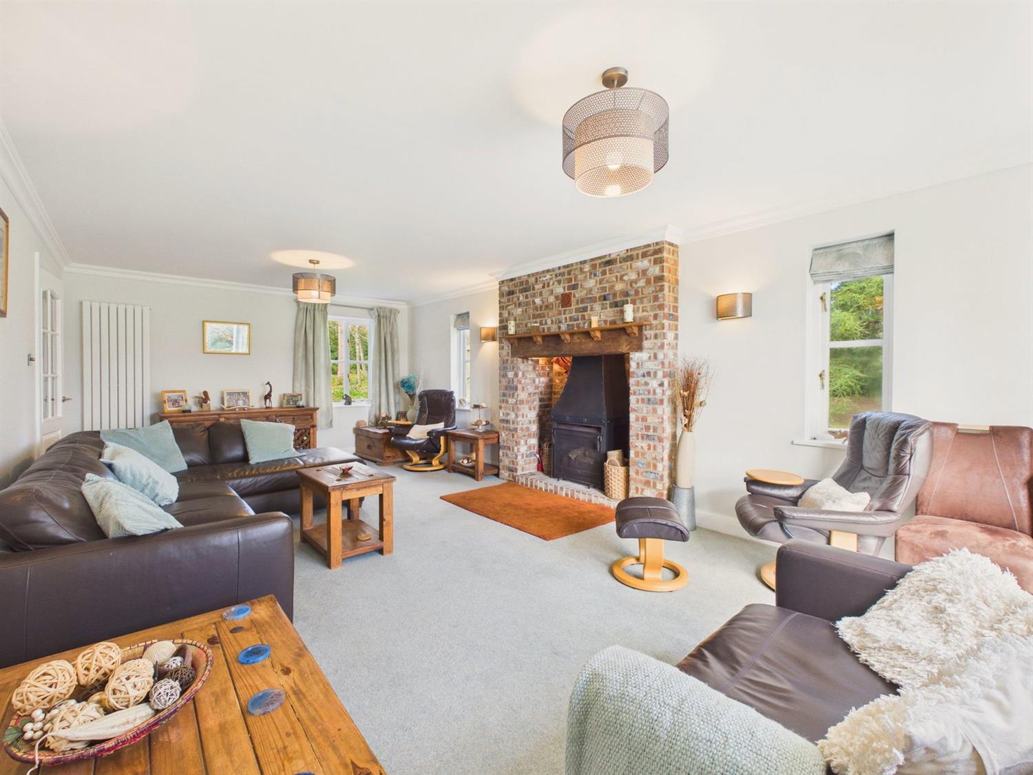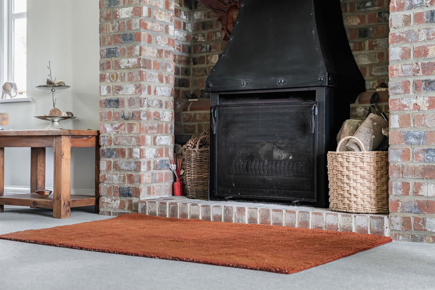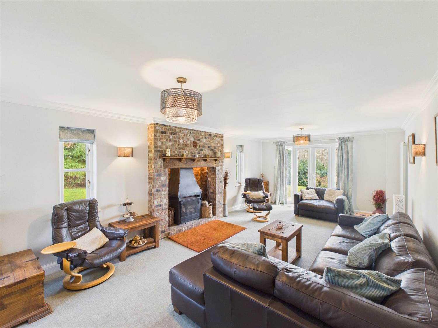 Sitting RoomA bright and spacious triple aspect room with windows to the front and side, and French doors opening onto the rear patio. The focal point of the room is an exposed brick inglenook fireplace with oak mantle and open fire. Additional features include vertical radiators, wall lighting, and Roman blinds.