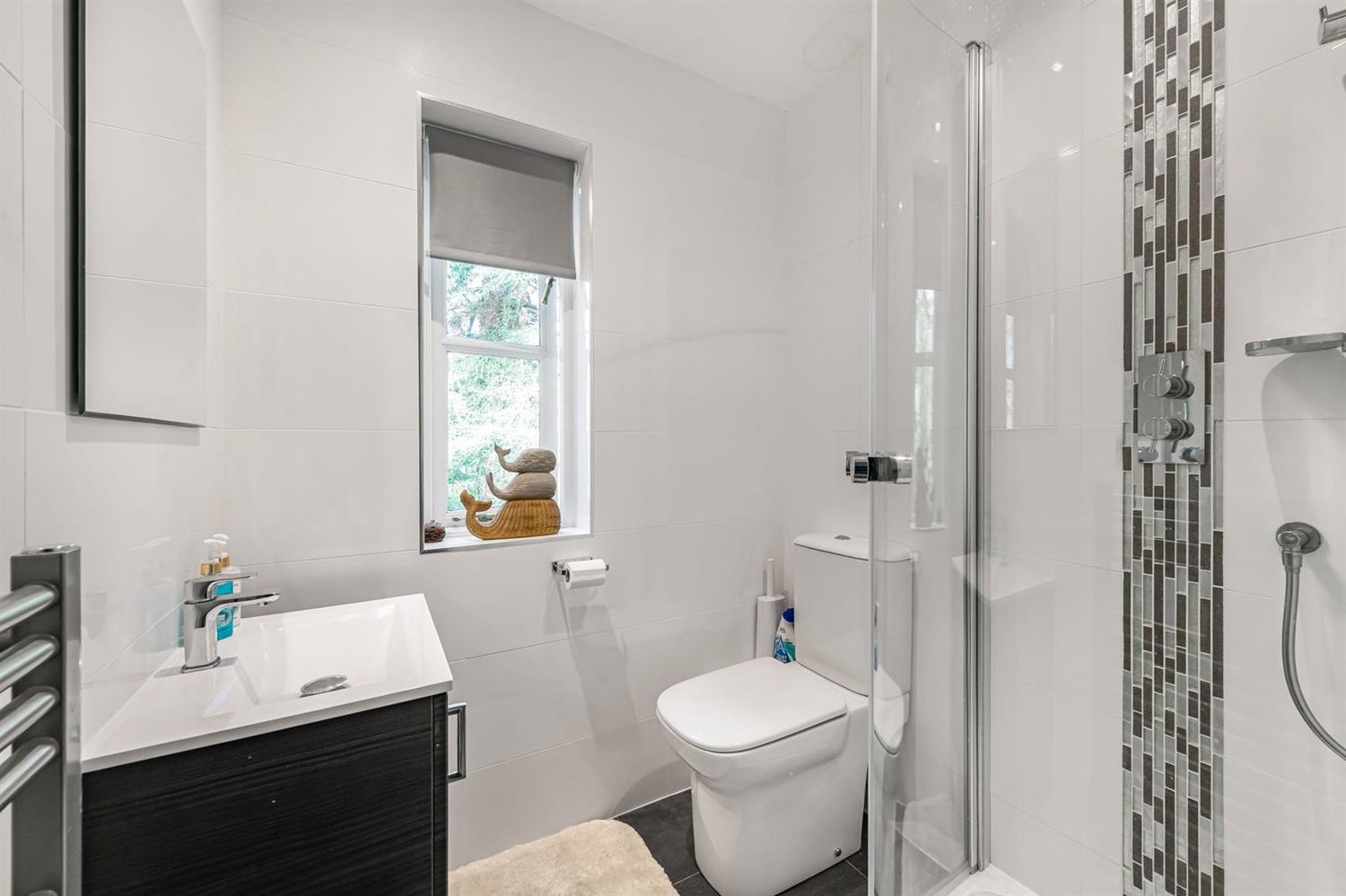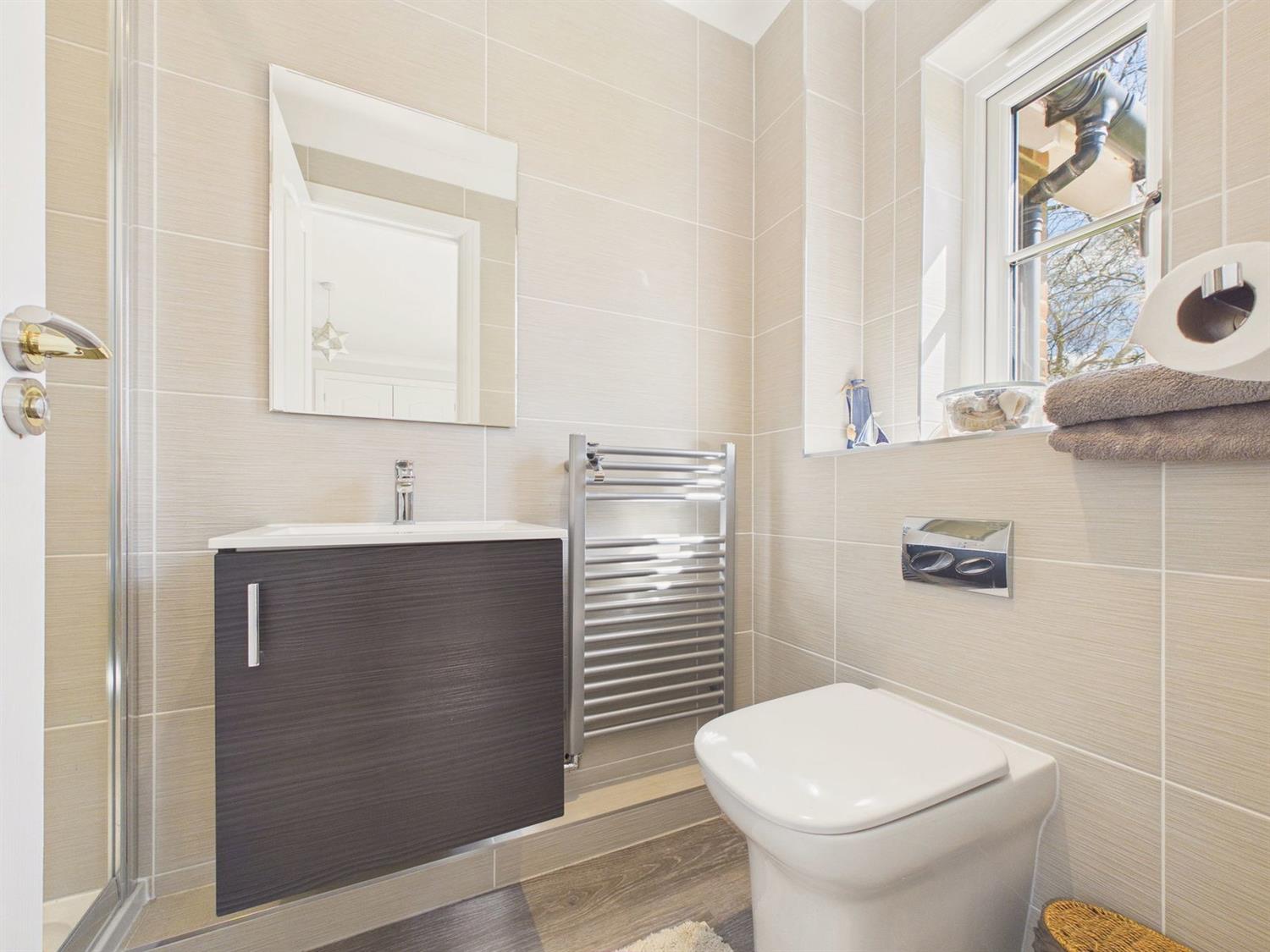 Downstairs Shower RoomFormerly a cloakroom, now converted into a high-specification wet room with walk-in shower, concealed fittings, wall-mounted shower attachment, and tiled niche. There is a wall-hung vanity unit with basin, mixer tap, and storage beneath, low-level WC, full height wall tiling, tiled floor, heated towel rail, obscured front aspect window, downlighting, and extractor fan.
