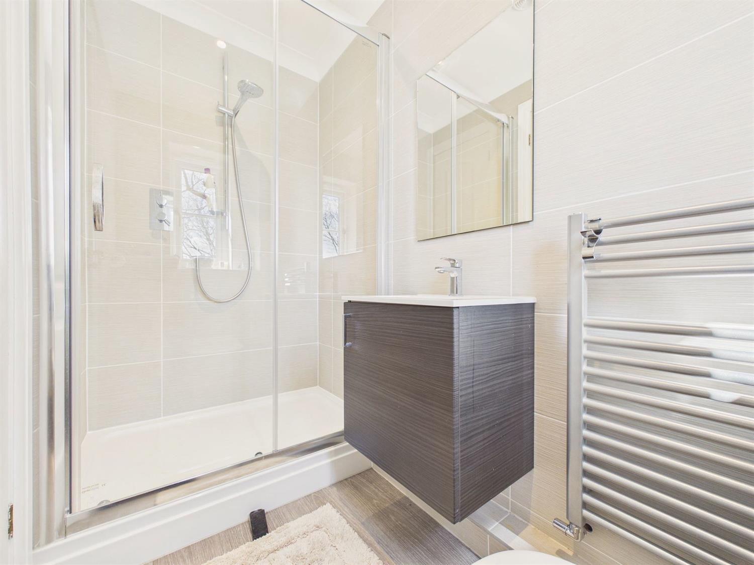 Ensuite Shower RoomComprising a walk-in corner shower with concealed fittings, low-level WC, wall-hung vanity unit with storage beneath, heated towel rail, side aspect window, full tiling, and downlighting.