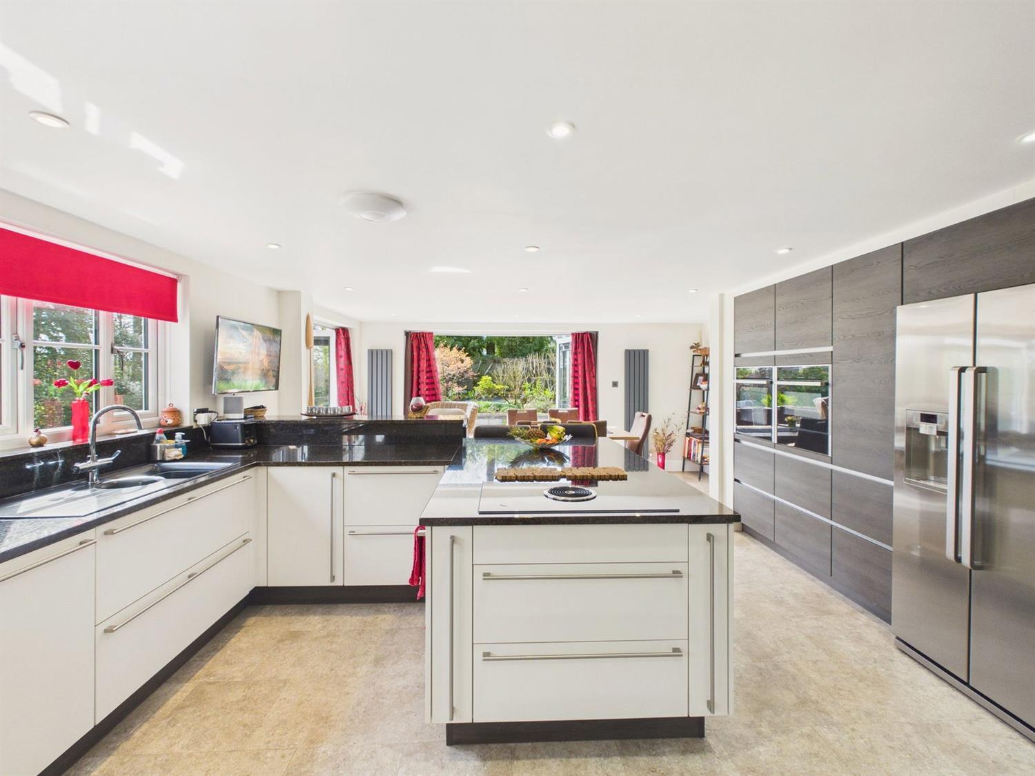 Kitchen / Dining RoomFormerly two rooms, this bright and open space has been thoughtfully reconfigured to create a superb open plan kitchen/dining area. There are rear aspect windows and two sets of folding doors opening onto the south-facing rear garden. The kitchen is fitted to a high specification with a range of eye and base level cabinets finished in matt white with complementing granite worktops over, extending to a breakfast bar seating area. Integrated appliances include Neff eye-level oven and combination grill with warming drawer, Bora electric hob with central extractor, Neff dishwasher, and wine cooler. There is space for an American-style fridge/freezer, alongside clever storage solutions including carousel units, pull-out larder storage, and integrated bin systems. Additional features include glass-fronted display cabinets, USB power points, downlighting, ventilation system, and modern vertical radiators. The dining area is generously sized and opens almost entirely onto the patio via folding doors. Karndean flooring runs throughout. A door leads to the utility room and there is a further half-glazed door to the family room.