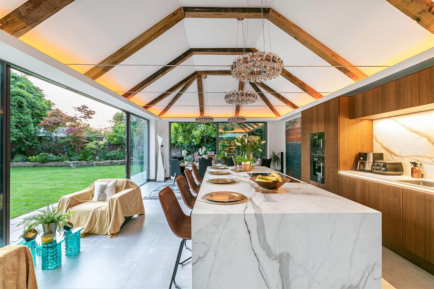 The heart of the home is a striking 40ft vaulted kitchen and dining room, featuring bespoke cabinetry, a central island, and integrated premium appliances. Full-height glazing and doors on two aspects provide excellent natural light and direct access to the garden, creating an ideal space for both everyday living and entertaining.