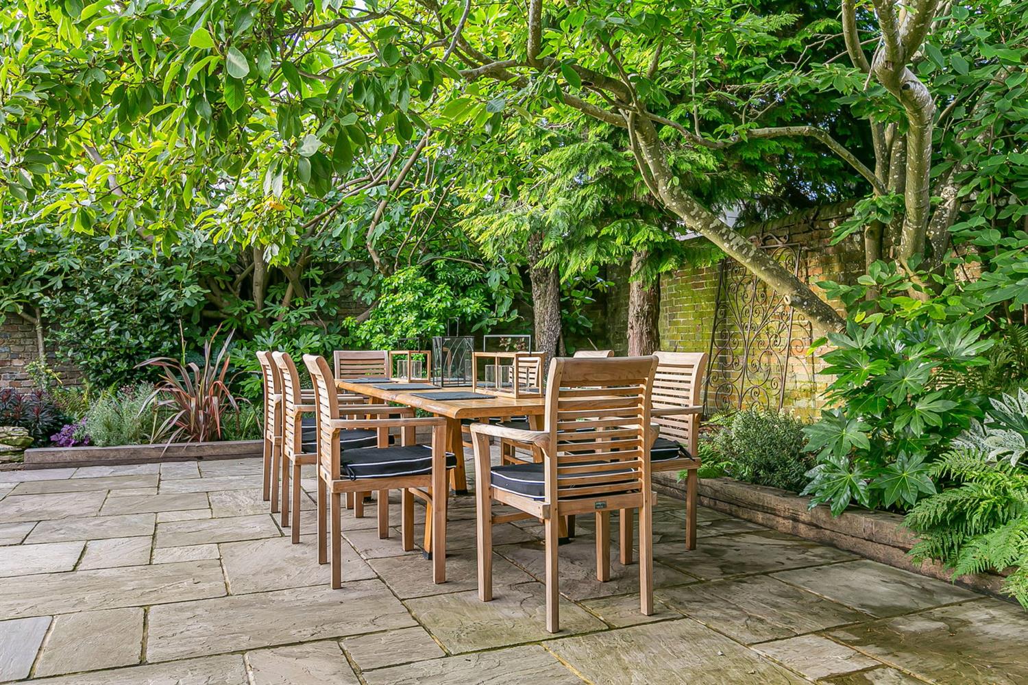 Externally, the property is approached via a paved forecourt enclosed by low walling and mature planting, with access to a tandem garage. The rear garden is a particular feature, being fully enclosed and thoughtfully landscaped with level lawn, well-stocked borders, a pond, and multiple eating areas, ideal for outdoor entertaining.