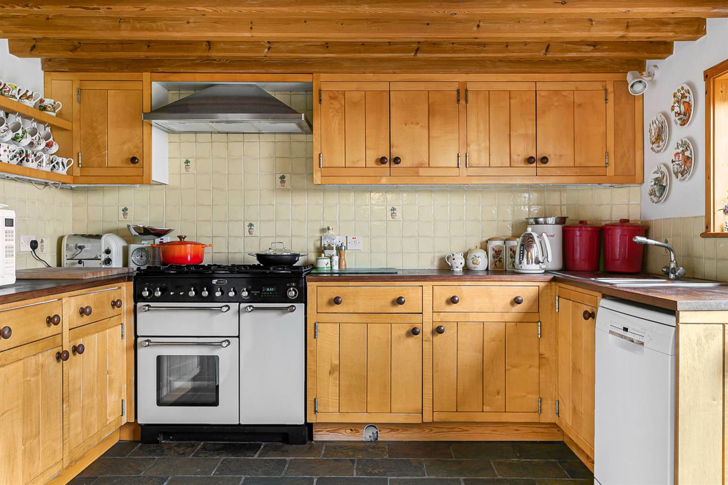 Kitchen/Breakfast Room With a handmade range of Maple fronted cabinets with matching drawers and Teak worktops with inset, stainless steel sink unit with mixer tap and drainer. Stone flooring, exposed joinery window and French doors both enjoying the superb outlook over the rear garden towards the view. large recess for range cooker with LPG connection and stainless steel filter light above.