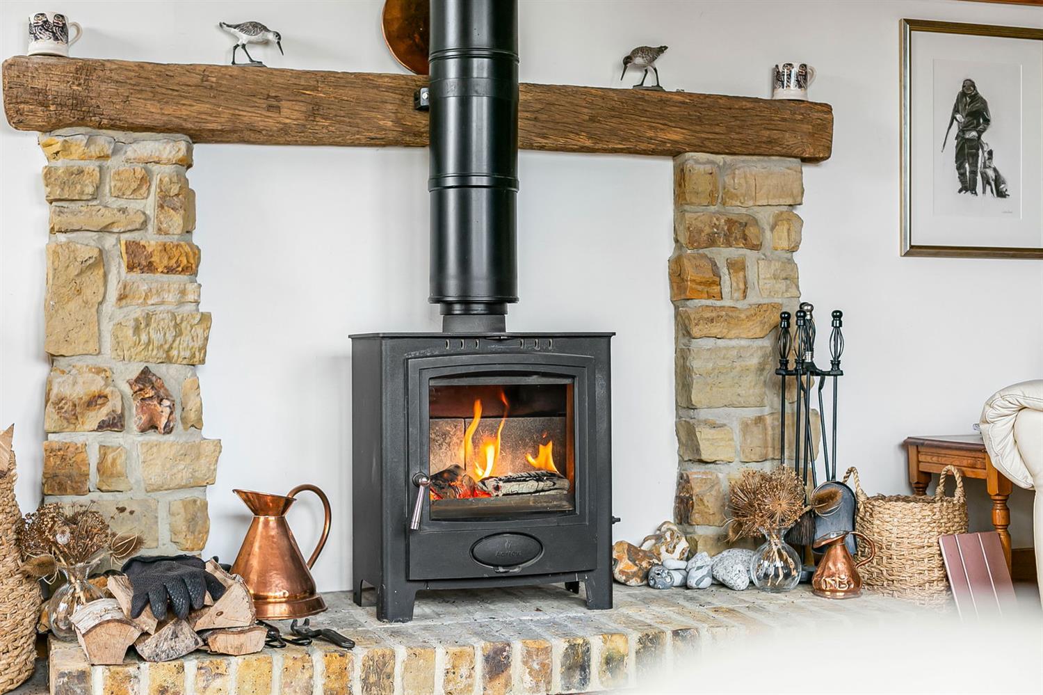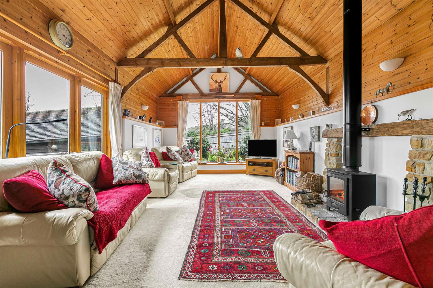 Fantastic Vaulted Reception Room With the original barn, trusses on full display ceilings, clouded to offer a mellow upper part with the plastered lower half also having a large display ledge all around, gallery side window and door with twin side panels, looking out into the Ward garden, stone effect Chimney piece with brick and oak over mantle and also housing the contemporary log burner with its visible flame and architectural flue. Wall lights and ceiling light point. TV aerial point.