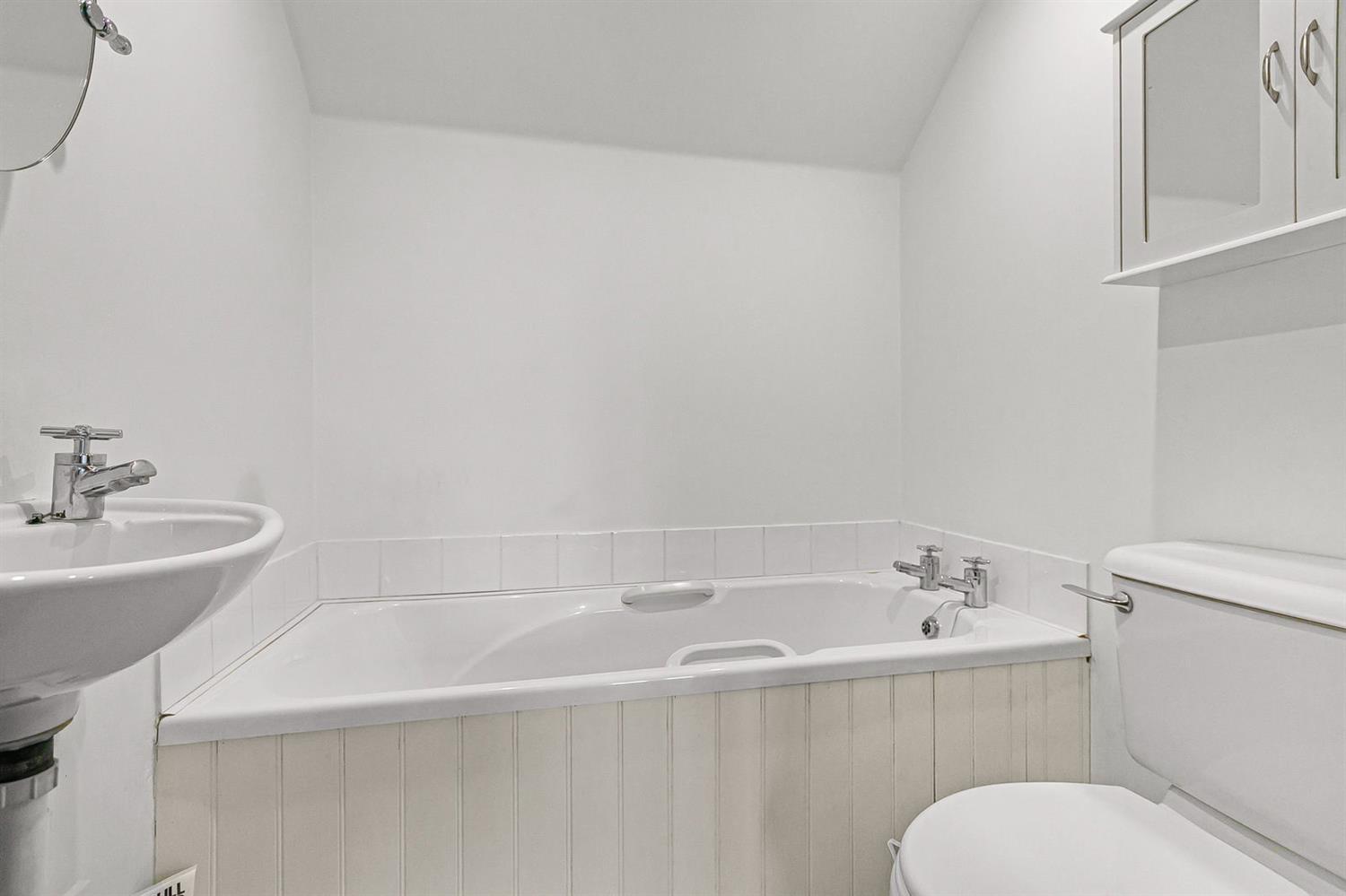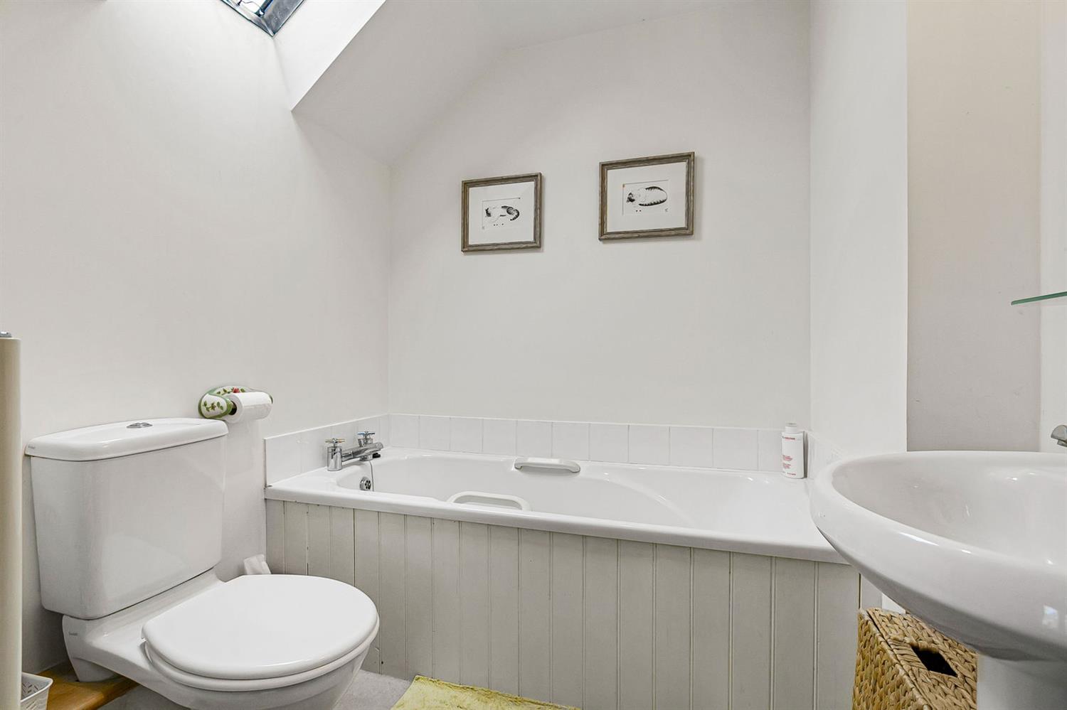 En-Suite Bathroom 1 With a white suite of bath with chrome pillar, mixer tap, low-level WC, pedestal wash and basin, partly vaulted ceiling with heritage skylight, towel warmer, strip light.
