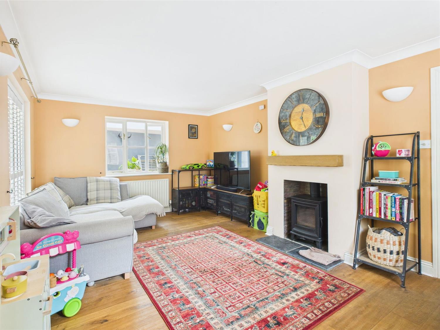 Sitting RoomTriple aspect with plantation shutters. Chimney breast with fireplace housing cast iron wood burner with wooden mantle over and slate hearth, two radiators, five uplighters, Oak flooring.