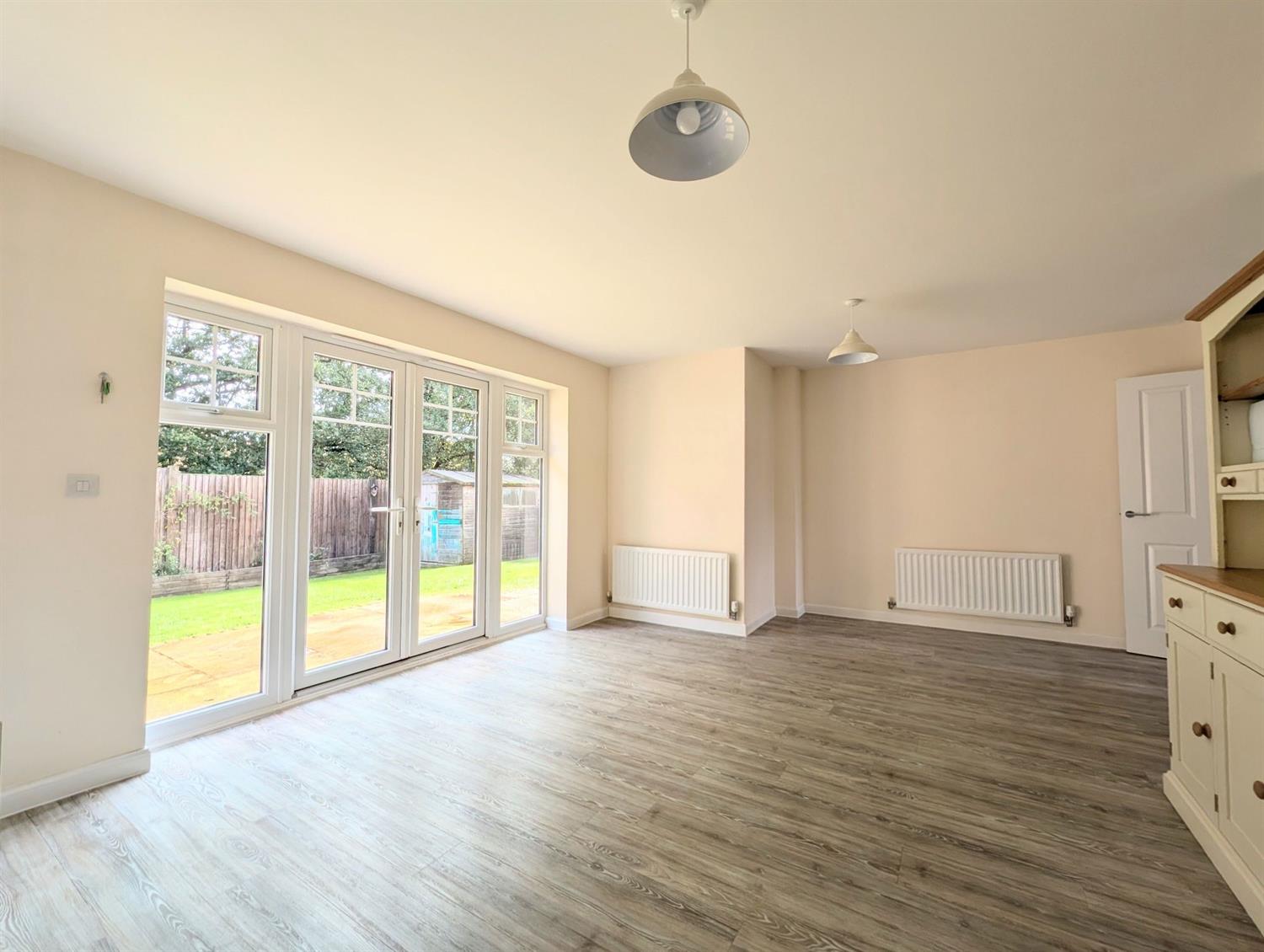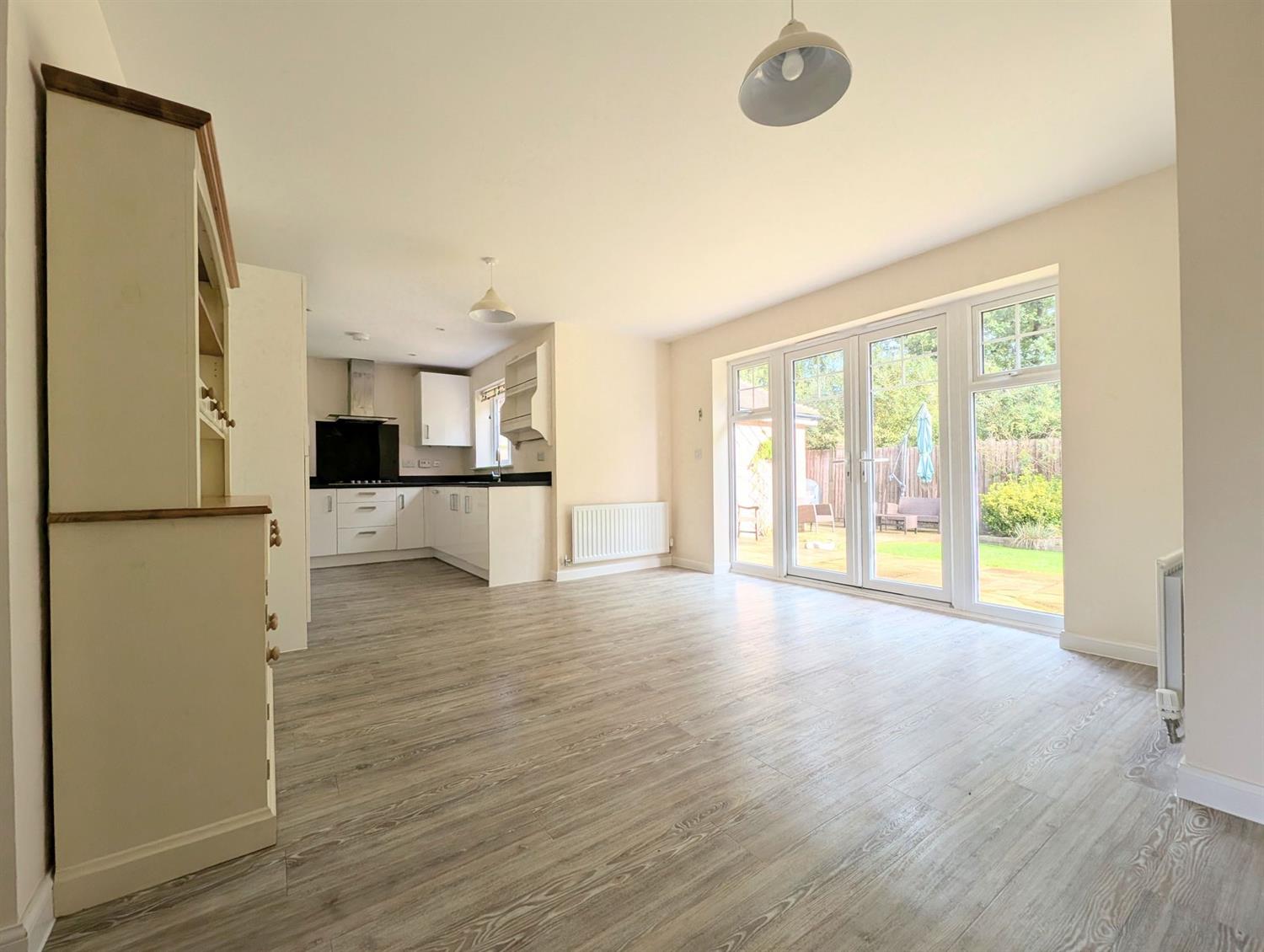 A very well presented detached family home situated within the highly regarded Kilnwood Vale development, with open views over green space to the front. The spacious accommodation comprises entrance hallway with courtesy door to the double garage, cloakroom, triple aspect sitting room with bay window, dining room with doors to the rear garden, great size kitchen / family room with appliances (oven, hob, fridge freezer, dishwasher and washing machine) and doors to the rear garden. To the first floor bedroom one benefits from a ensuite shower room and walk in wardrobe. Three further double bedrooms and a family bathroom. Outside to the front is off street parking for two cars leading to the double garage. To the rear the garden benefits from a large patio area and garden shed. Unfurnished. EPC rating B.